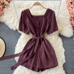 Korean style temperament square neck puff sleeve lace-up waist wide-leg jumpsuit women straight shorts small high waist