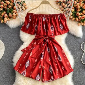 Off-Neck Bohemian Printed Ruffled Bandeau One-Shoulder Loose Casual Vacation Jumpsuit Wide Leg Shorts for Women