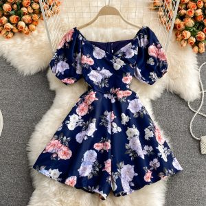 Holiday style printed square neck jumpsuit folds Slim Western style bubble sleeve wide-leg shorts jumpsuit summer