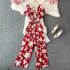 Light ripe wind socialite v-neck floral chiffon jumpsuits summer new waist jumpsuits leisure loose wide-legged pants