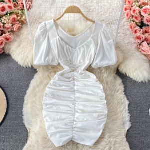 Mature Elegant V-neck Dress Summer New Slim-Fit Pleated Western Style Puff Sleeve Ruffle Hip Short Skirt