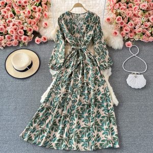 Lightly Mature Printed V-neck Dress Summer Gentle Graceful Puff Sleeve Tight Waist Super Fairy Swing Dress