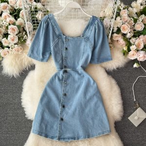 Midriff Outfit Denim Dress for Women Summer New French Square Collar Temperament Small Size Puff Sleeve A- line Skirt Skirt