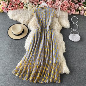 Gentle wind round neck dress, short sleeves, waist, thin, hollow, western style, bubble sleeves, A-line skirt long skirt, summer