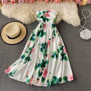 Holiday Sexy High Waist Rose Print off-the-Shoulder Tube Top Dress Vintage Pleated Elegant Dress Large Swing Dress