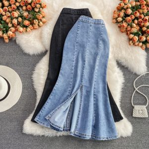 Denim High Waist Slit Skirt Women’s A- line Skirt Ruffled Mid-Length below the Knee Slim Fit Slimming Fishtail Hip Skirt