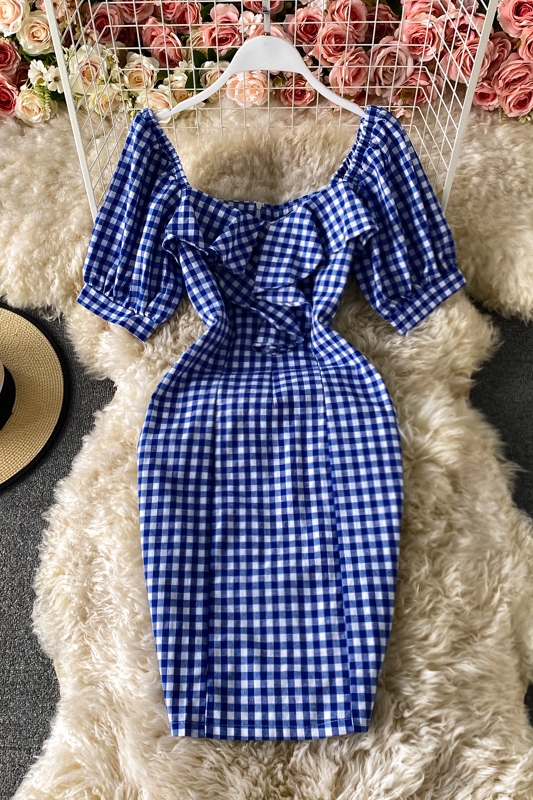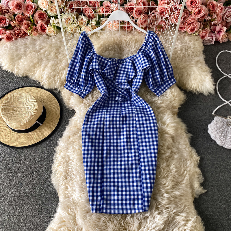 Cheap Dresses, Buy Quality Women’s Clothing Directly from China Suppliers:summer New Elegant Ruffle Square Collar Plaid Sheath Dress Slim Fit Slimming Short Hip Skirt