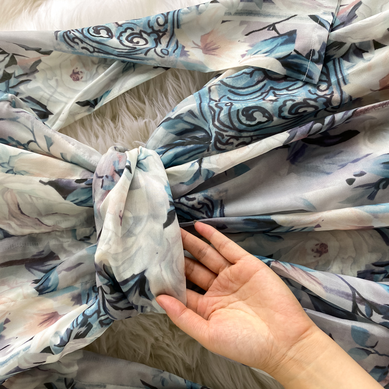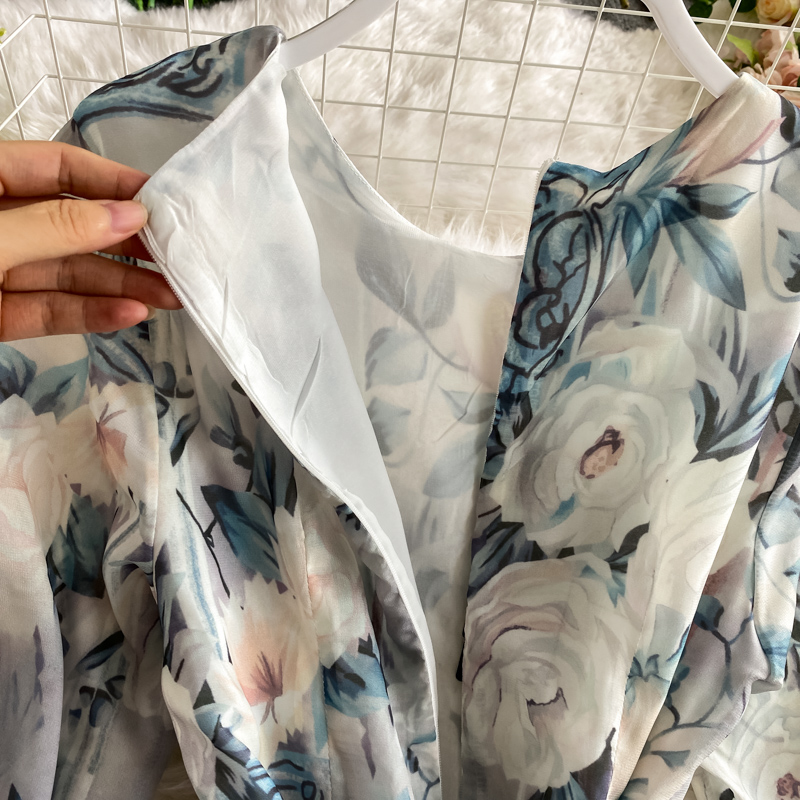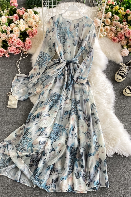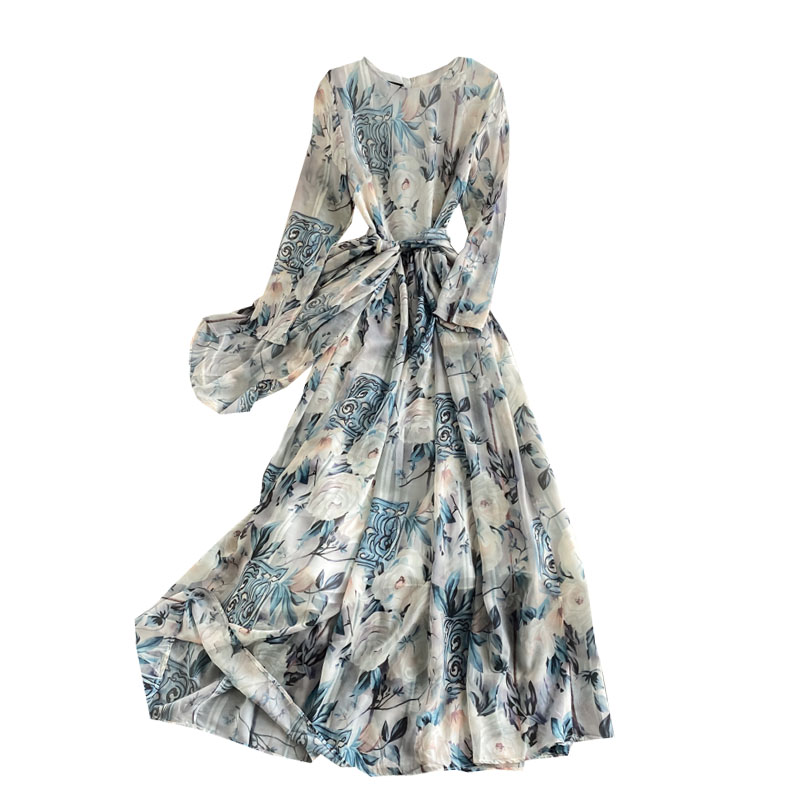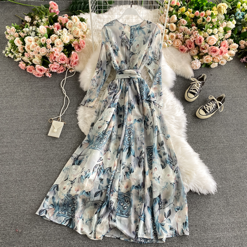 Holiday wind round collar dress fashion temperament hubble-bubble sleeve show thin printed big long skirt