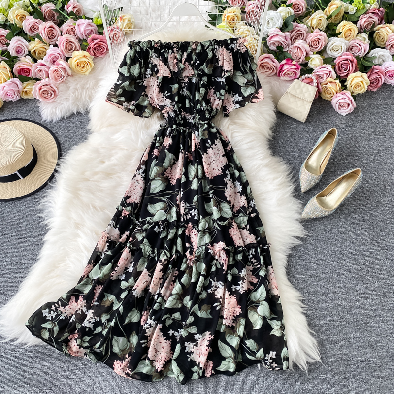 Strapless dress seaside holiday beach dress temperament purple floral skirt waist posed dress chiffon