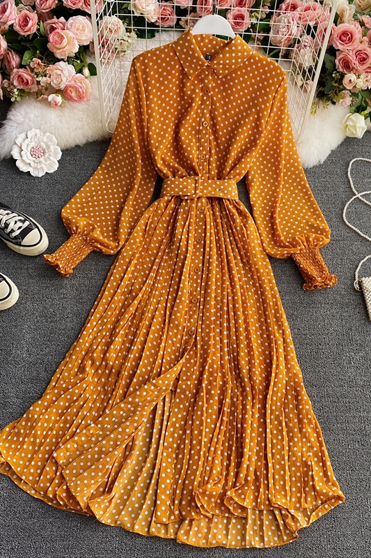 Wave point chiffon shirt collar dress posed long pleated skirt waist