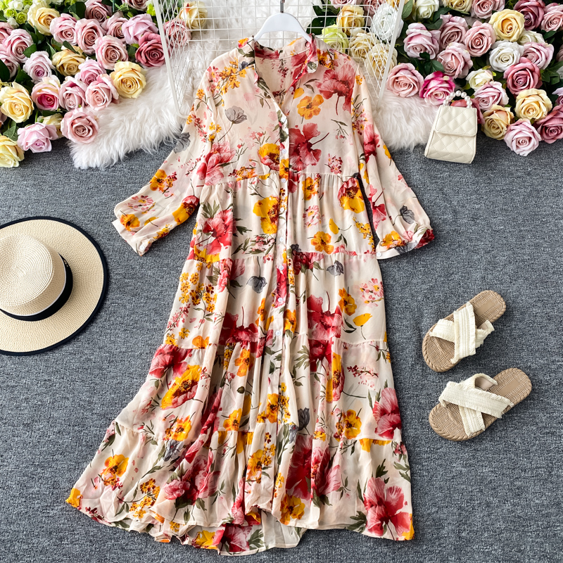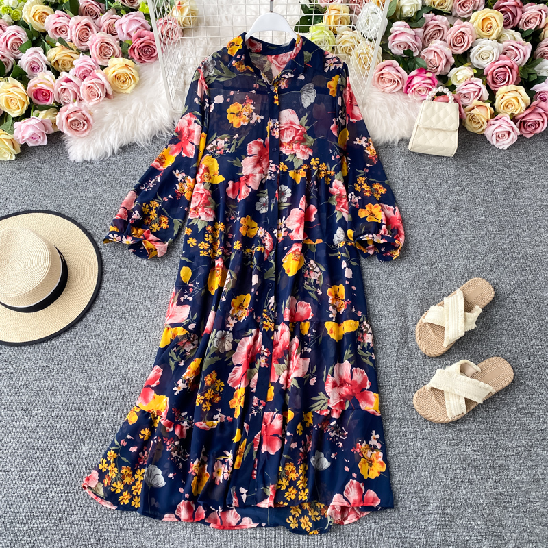 Bohemia resort island beach dress loose big wind French printing chiffon dress code is prevented bask in clothes