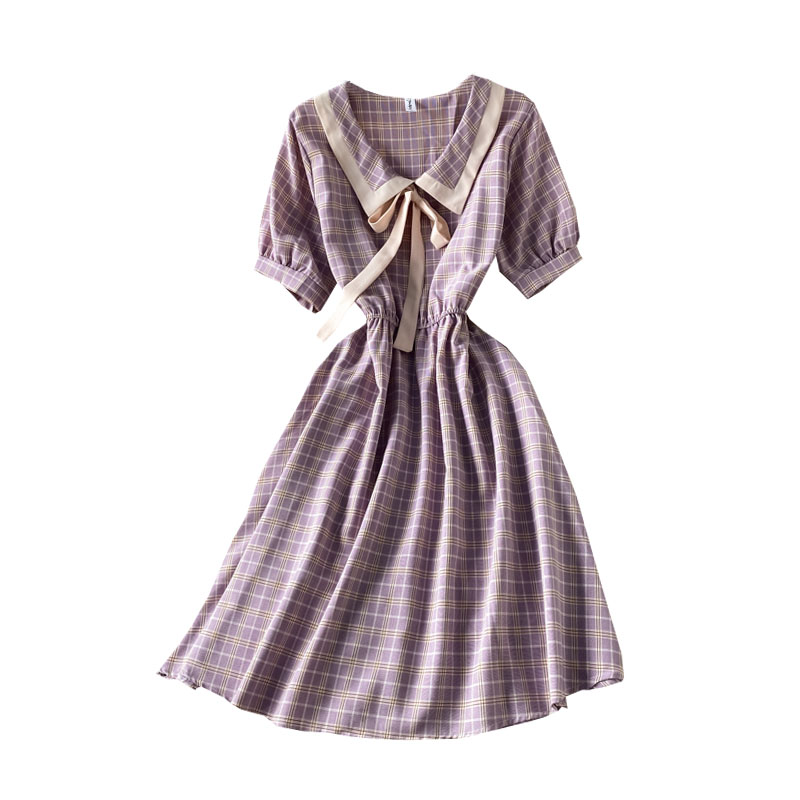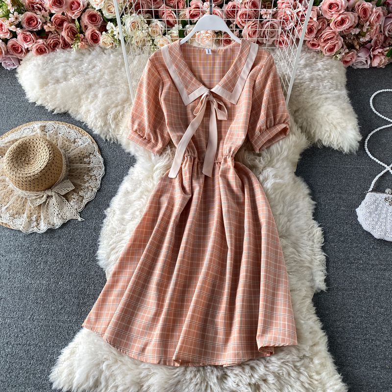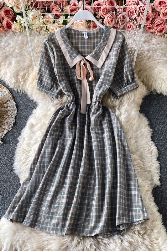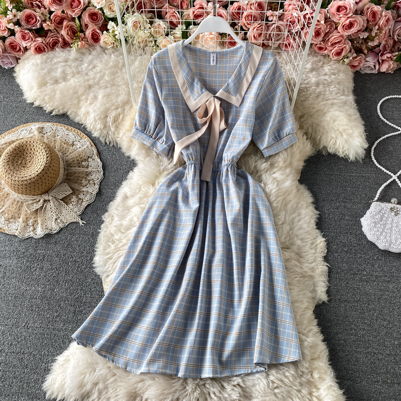 Cheap Dresses, Buy Quality Women’s Clothing Directly from China Suppliers:Summer Little Fresh Sweet Color Matching Doll Collar Lace up Bow High Waist Slimming Plaid Dress Short Sleeve
