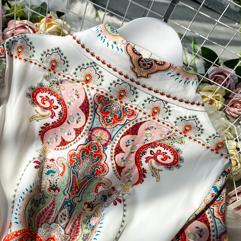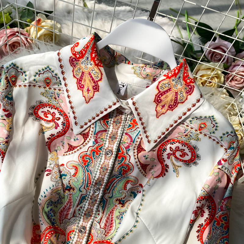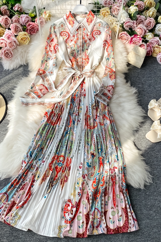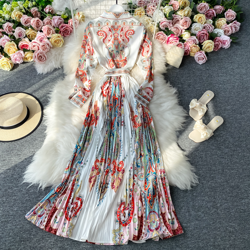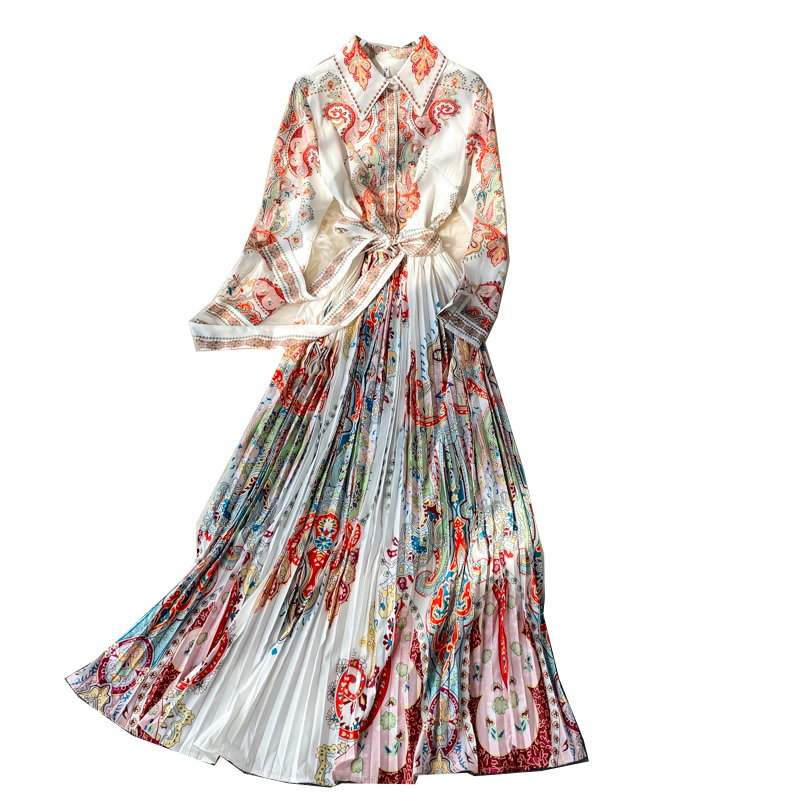 Early autumn French long skirt, positioning printing, waist is thin, ladies shirt skirt, big pleated dress, long sleeves