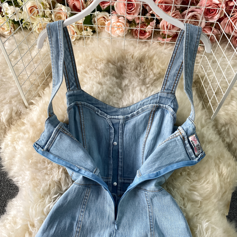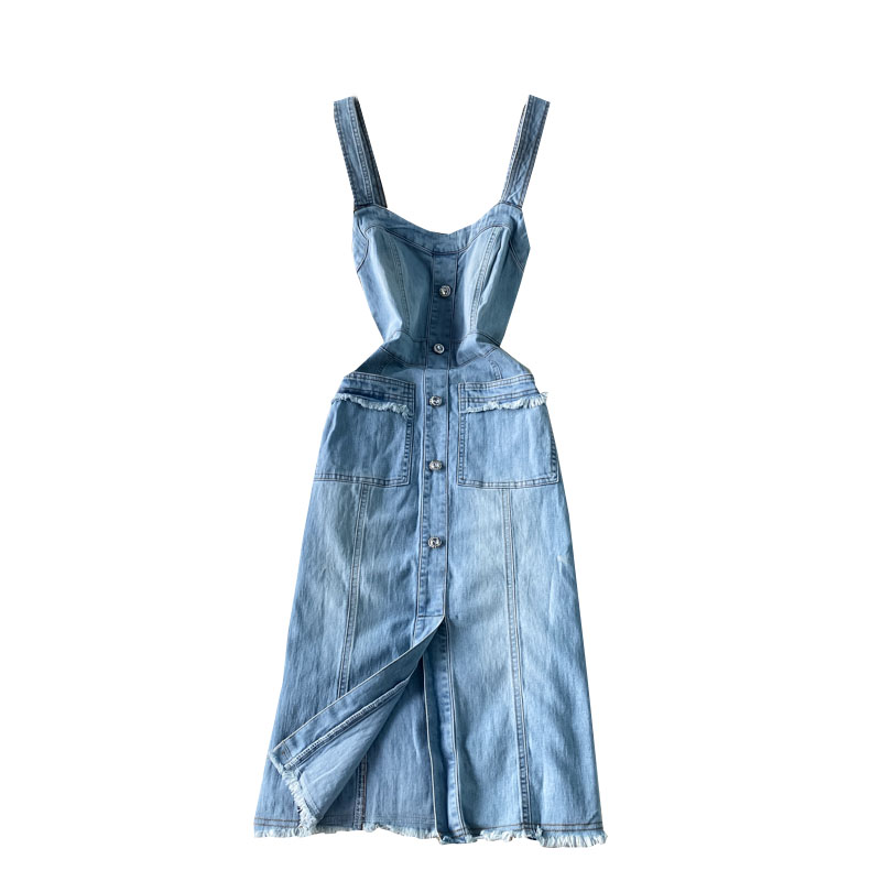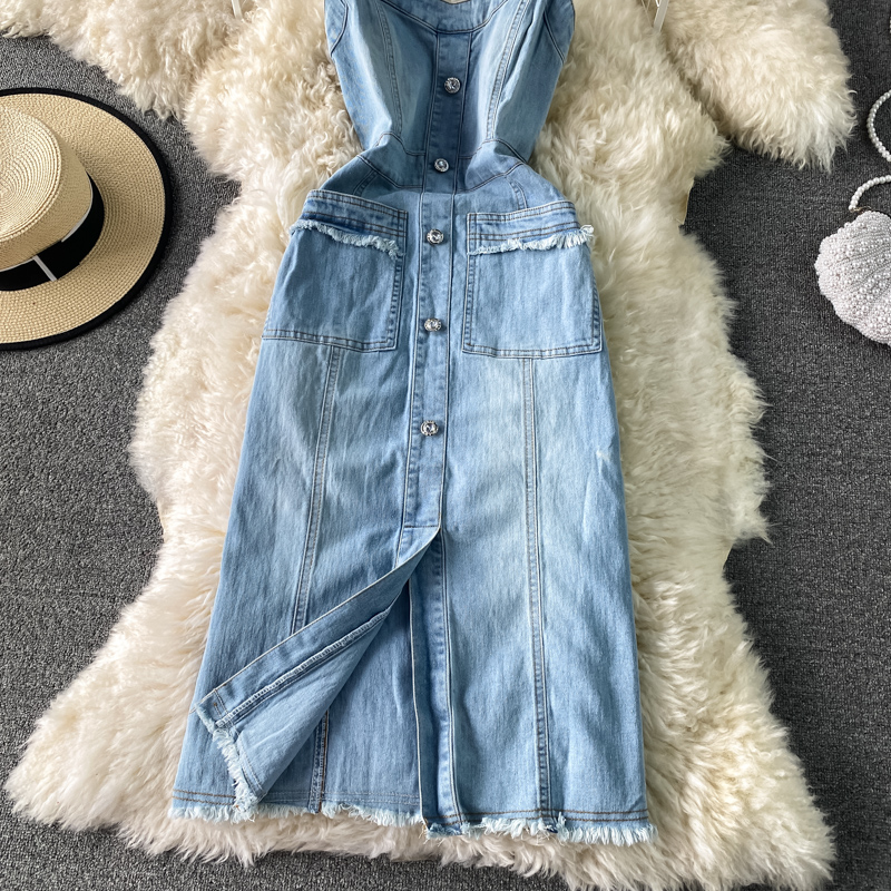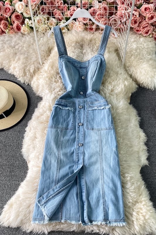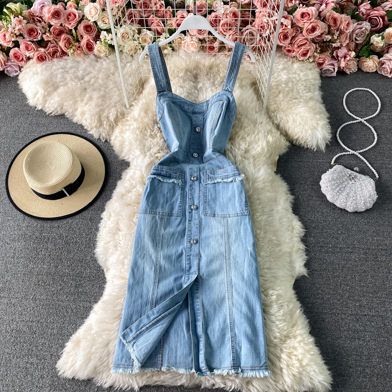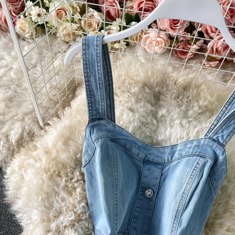 Cheap Dresses, Buy Quality Women’s Clothing Directly from China Suppliers:Spring New Korean Style Raw Hem High Waist Dress Mid Length Slim Fit Bandeau Sling Denim Suspender Skirt