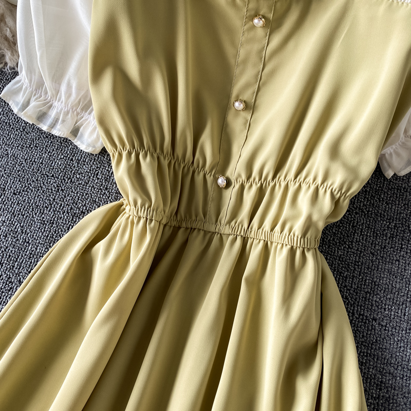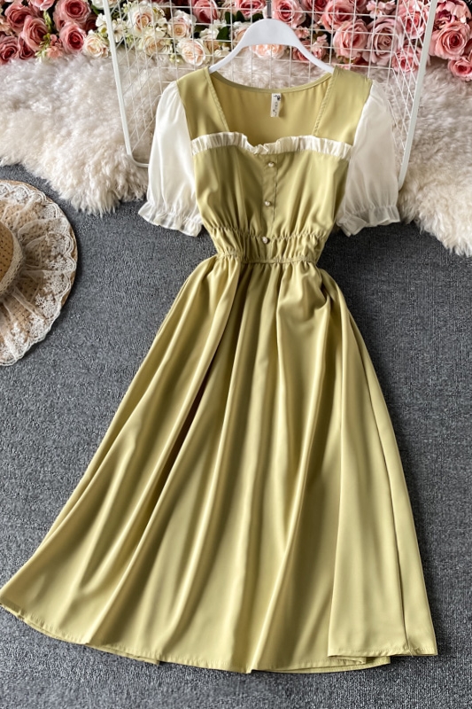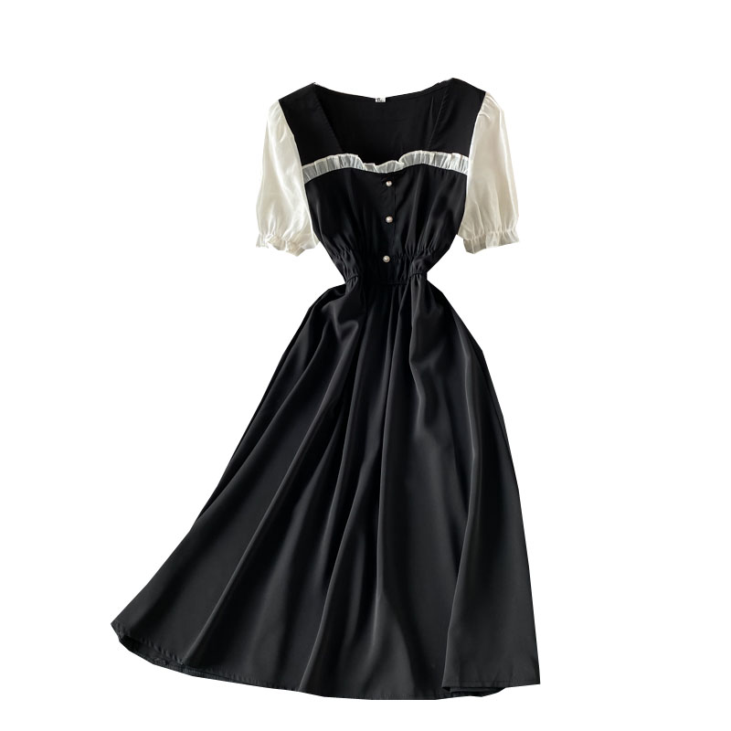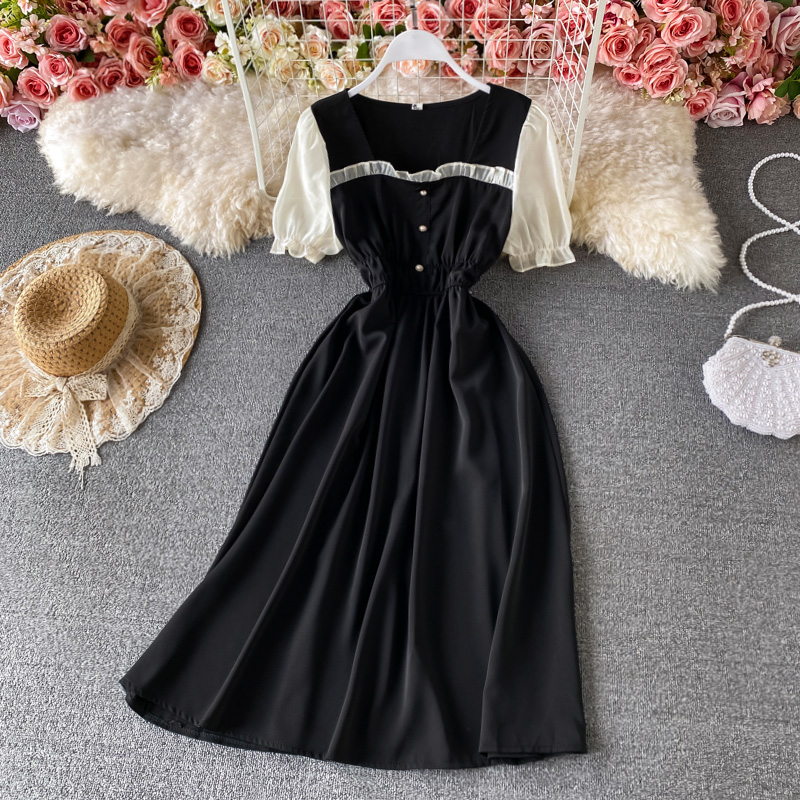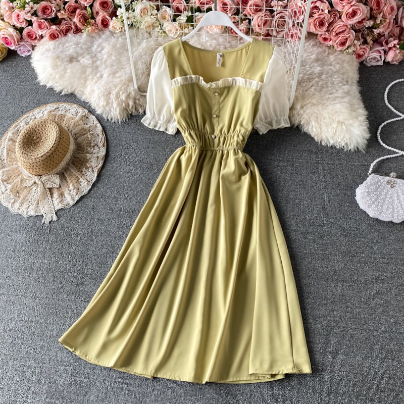 Retro Fake Two Pieces Square Collar Dress Short Sleeve Spring New Elegant Chic Waist-Tight Lady Mid-Length Skirt