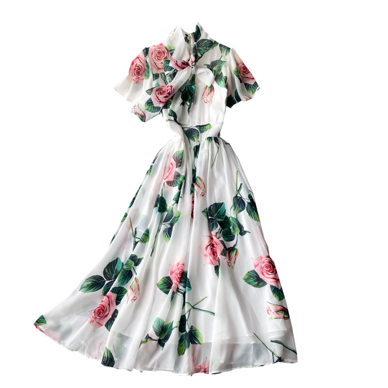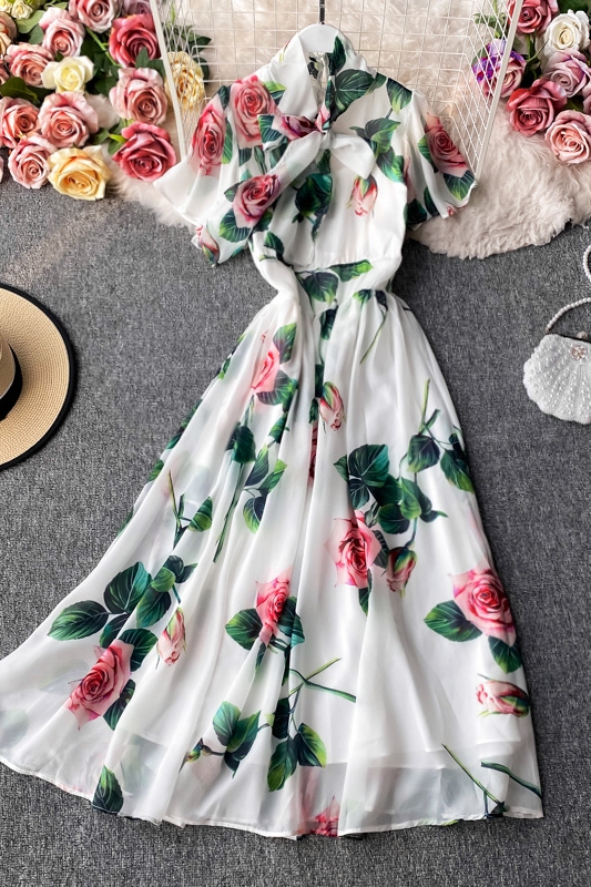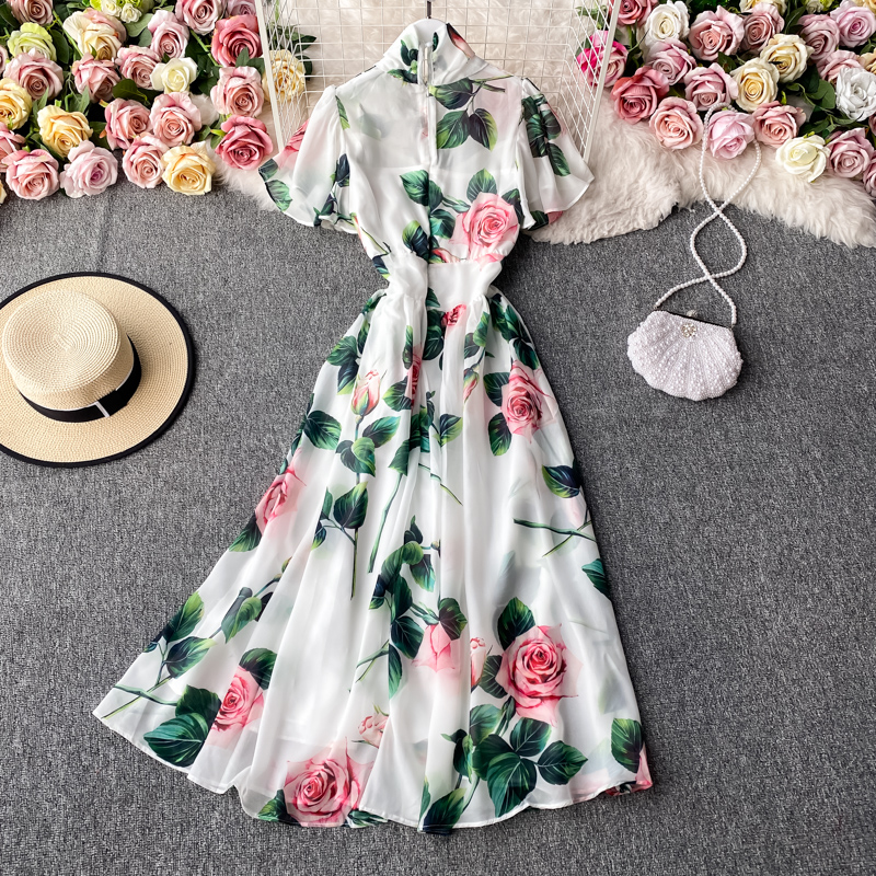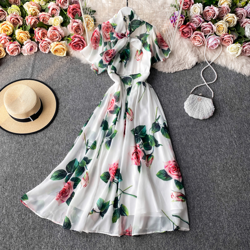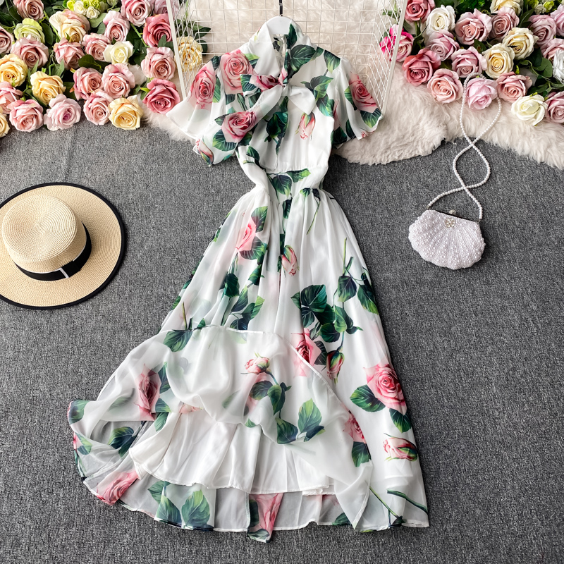 Cheap Dresses, Buy Quality Women’s Clothing Directly from China Suppliers:Printed dress goddess fan summer new waist chiffon temperament long skirt elegant lotus leaf sleeve holiday big swing skirt