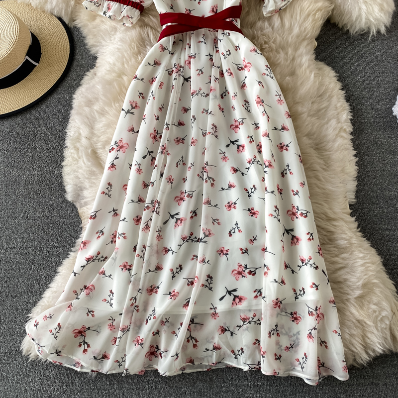Summer super fairy dress square neck puff sleeve first love fairy dress French retro temperament goddess fan floral skirt