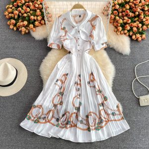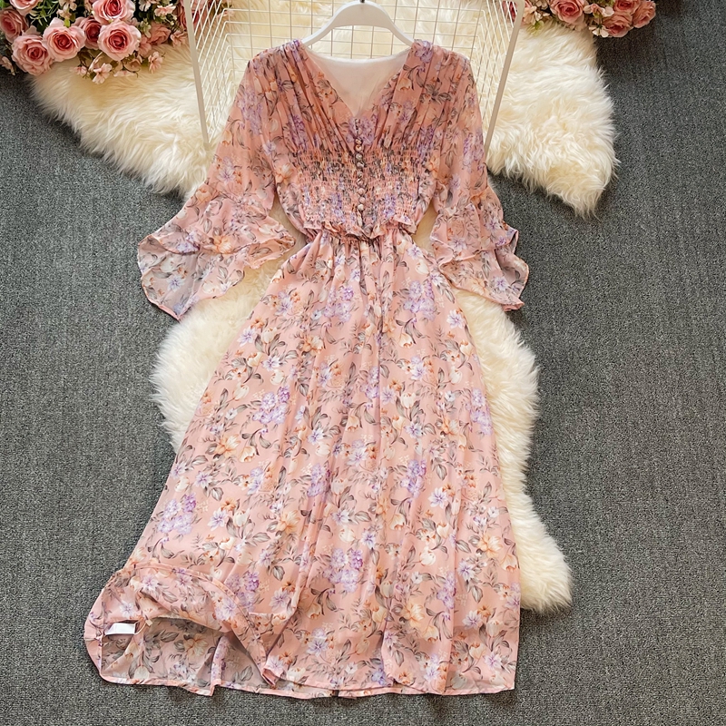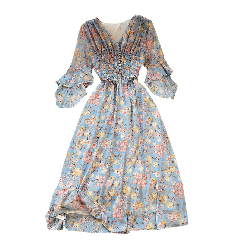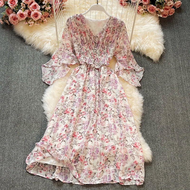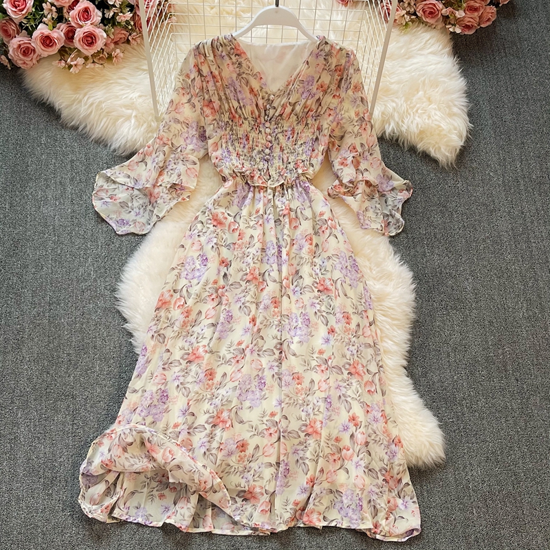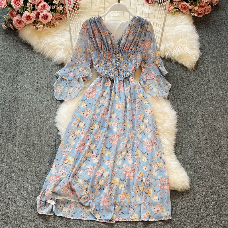 Cheap Dresses, Buy Quality Women’s Clothing Directly from China Suppliers:Â Summer New Elegant V neck Fitted Waist Sweet Floral Chiffon Dress Flared Sleeve Western Style High Waist A line Dress