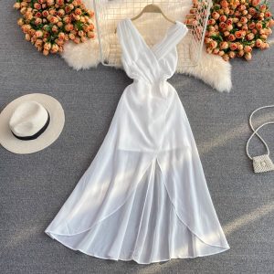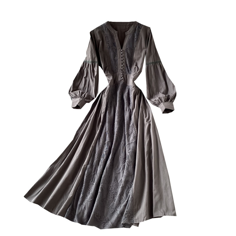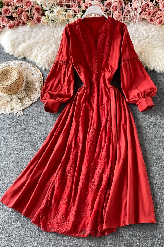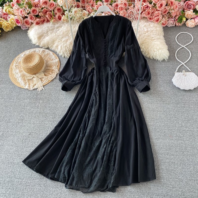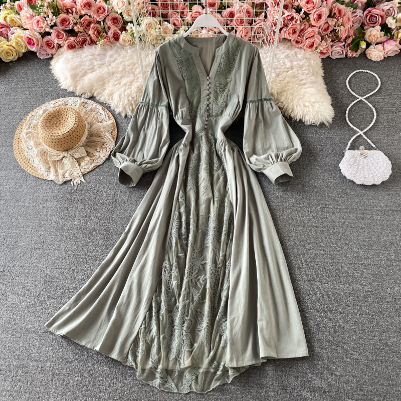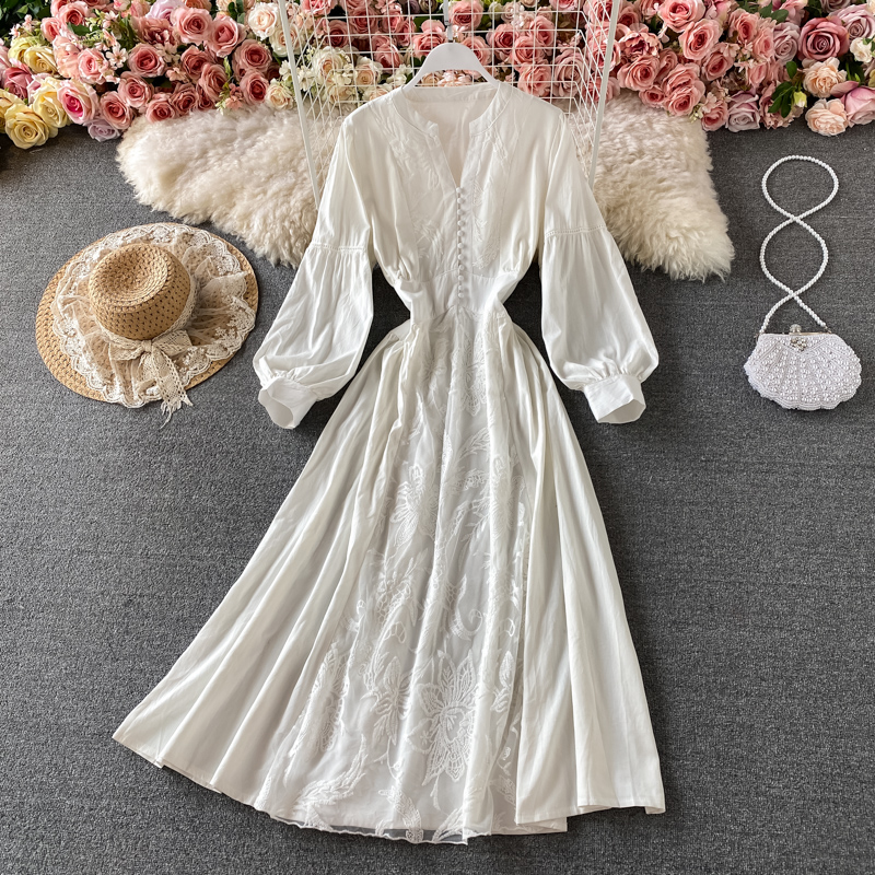 Korean chic gentle wind waist lantern sleeve V-neck dress elegant temperament embroidery large swing holiday long skirt female