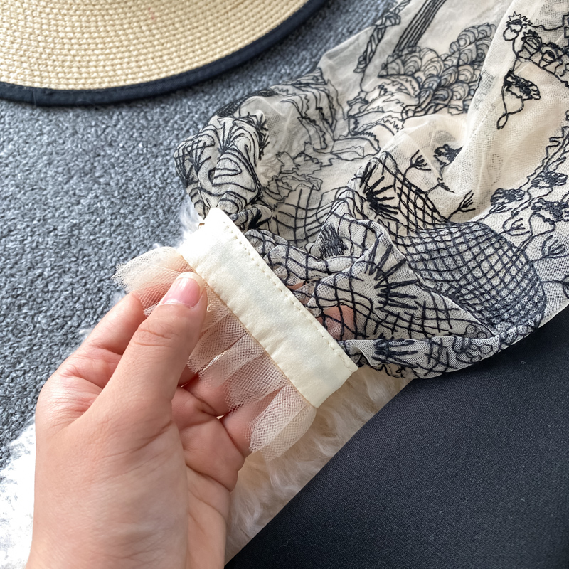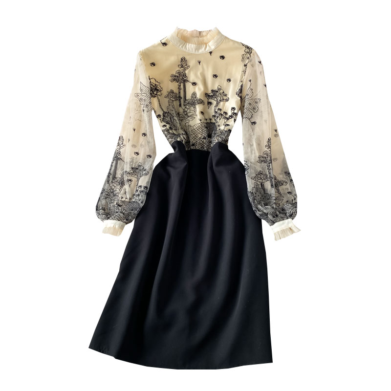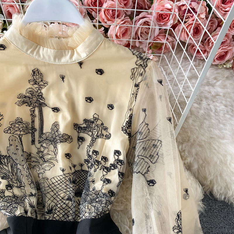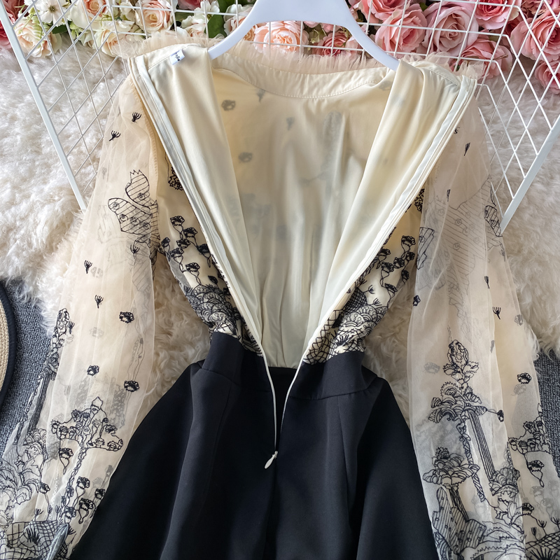 spring elegant temperament wood ear stand collar stitching embroidered mesh fake two-piece waist slimming a-line dress