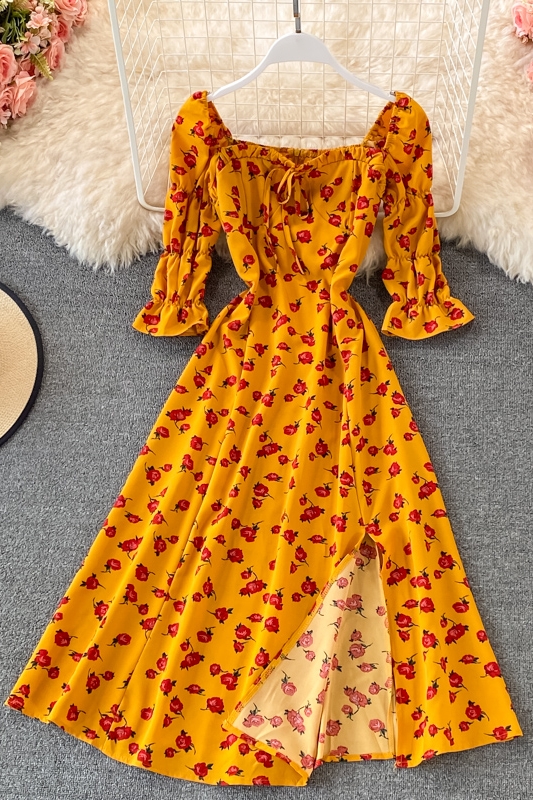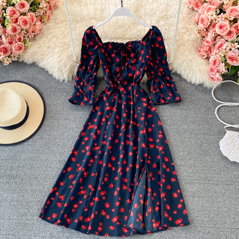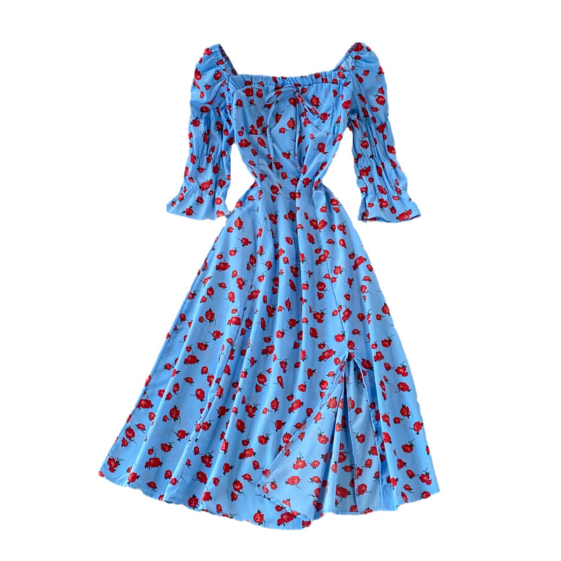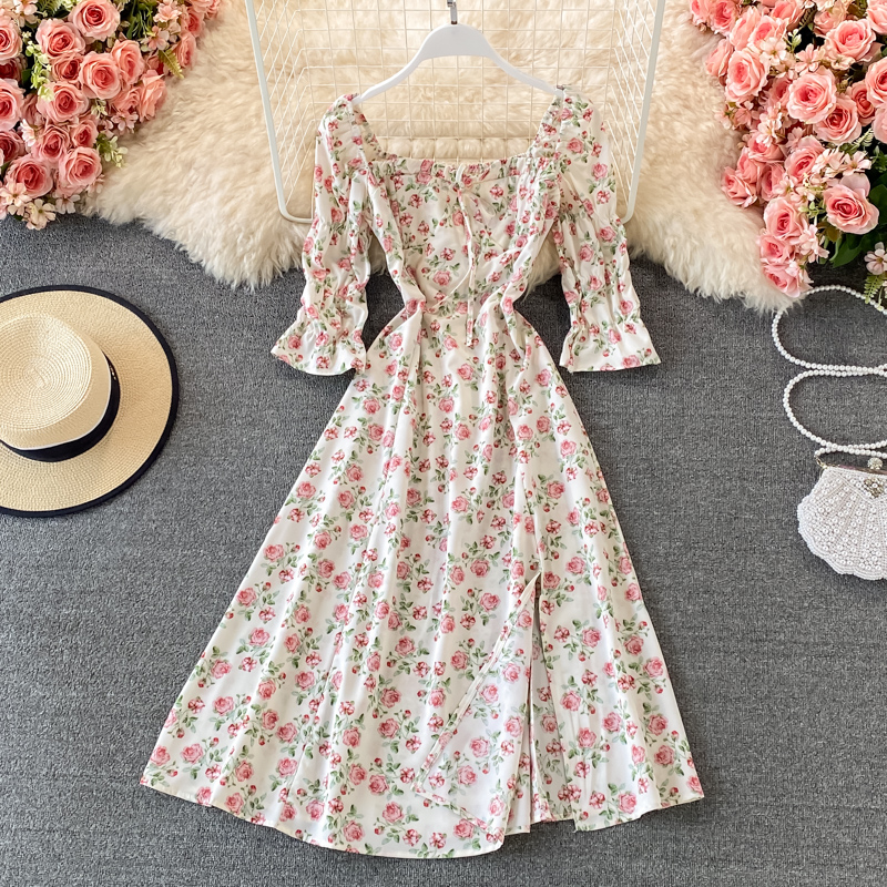 Cheap Dresses, Buy Quality Women’s Clothing Directly from China Suppliers:Square Collar Split Dress Summer Chiffon Floral Skirt Elegant Slim Fit Slimming Seaside Holiday Beach Dress A line Skirt