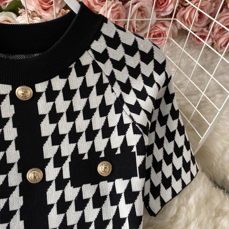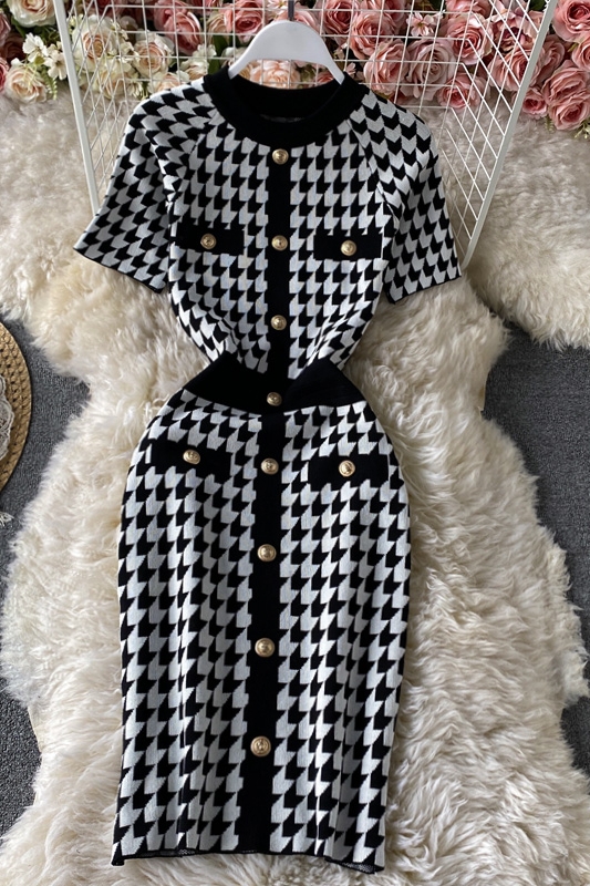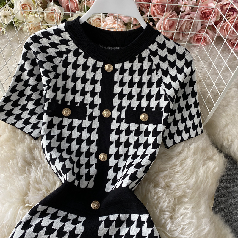 Cheap Dresses, Buy Quality Women’s Clothing Directly from China Suppliers:Summer new style Yujie temperament light cookedstyleSlimbag hip skirt houndstooth contrast color knitted dress with short sleeve