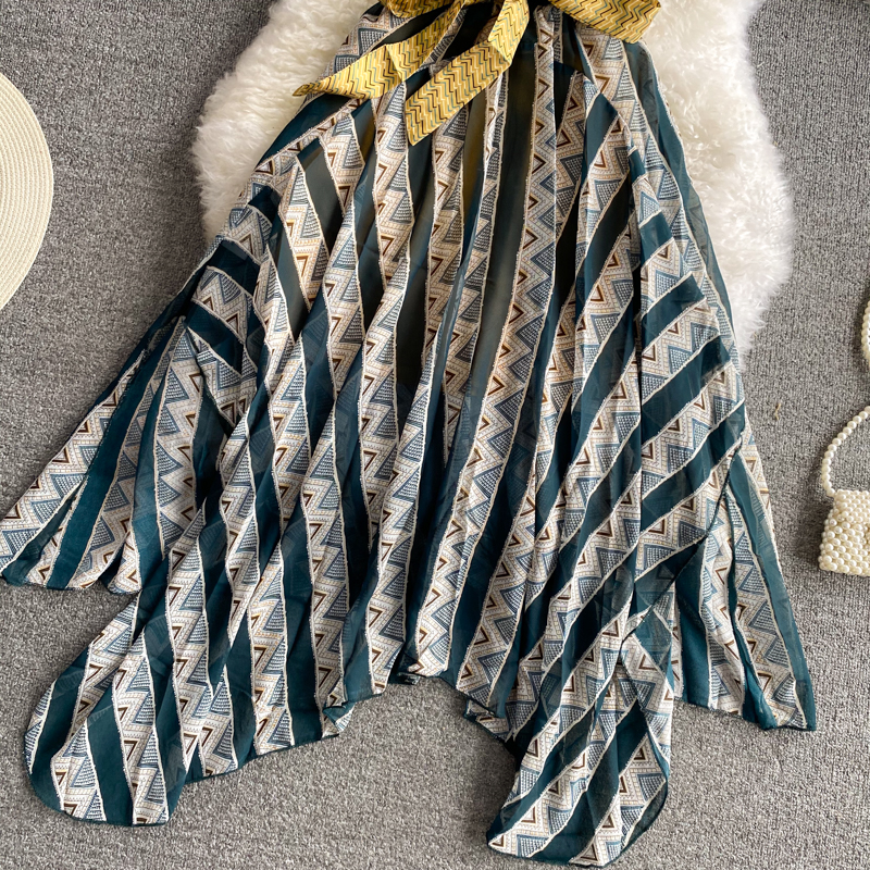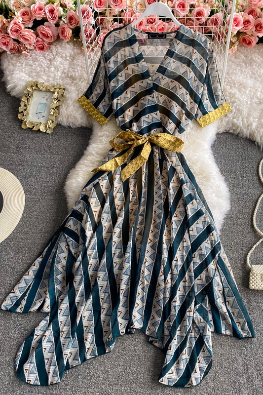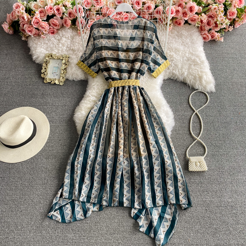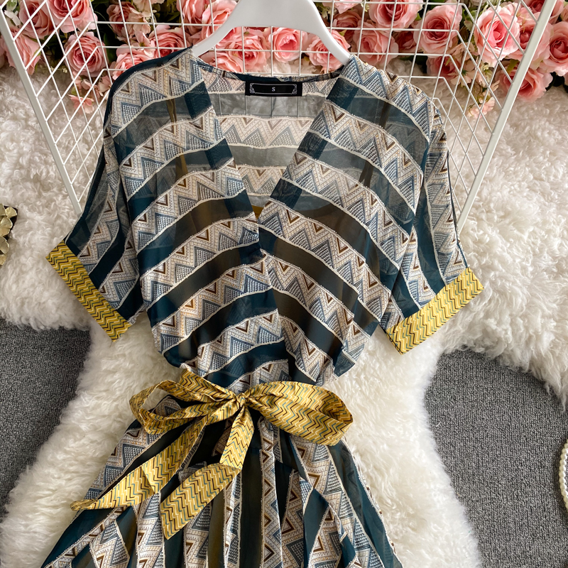 Bali Thailand Travel Super Fairy Beach Skirt Seaside Vacation Bohemian V-neck Chiffon Striped Dress Summer