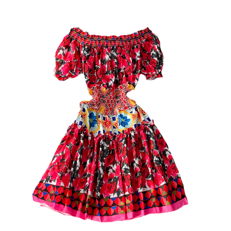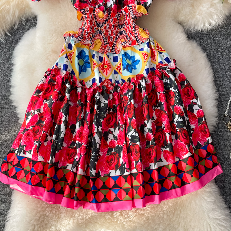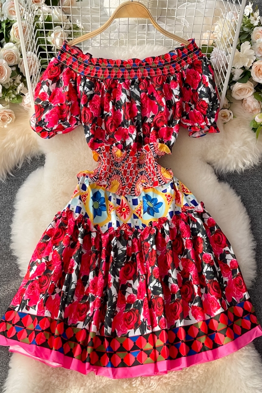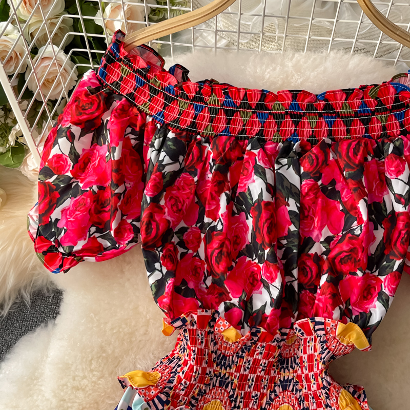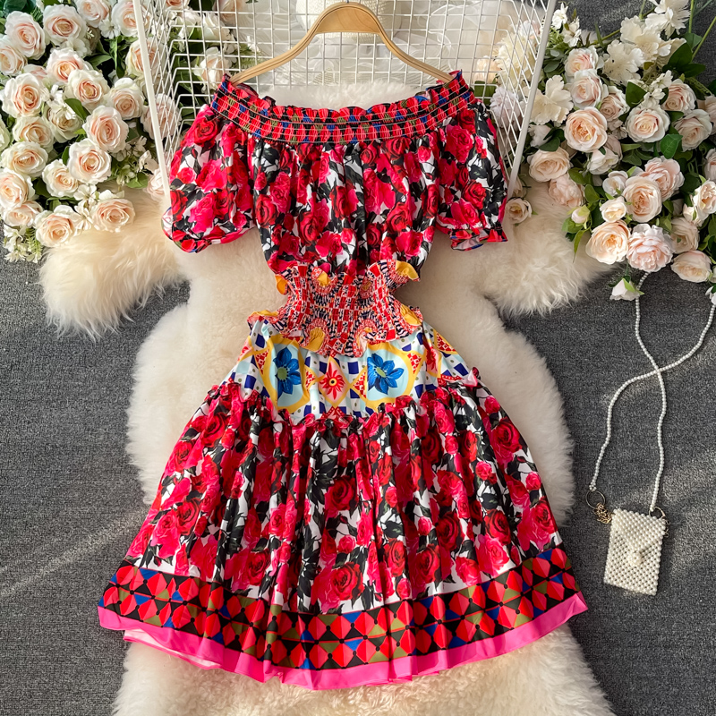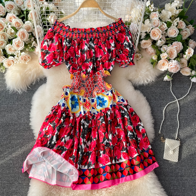 Summer New Waist-Tight off-Shoulder Shoulder-Baring Puff Sleeve Sweet Slim Fit Slimming Rose Printed Dress