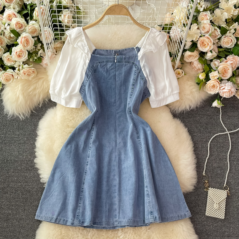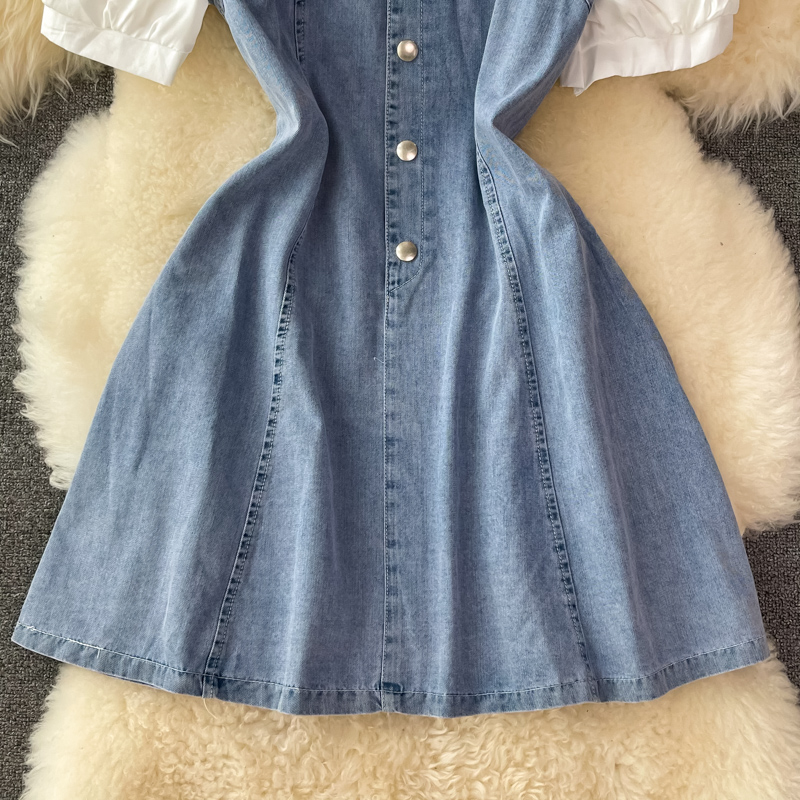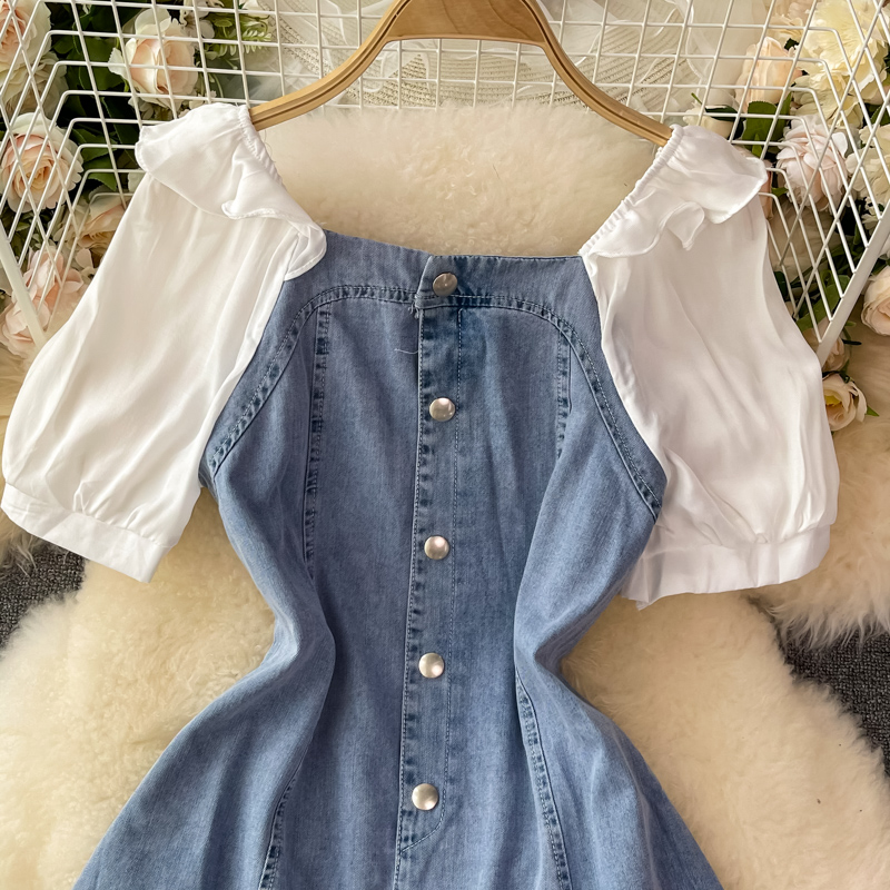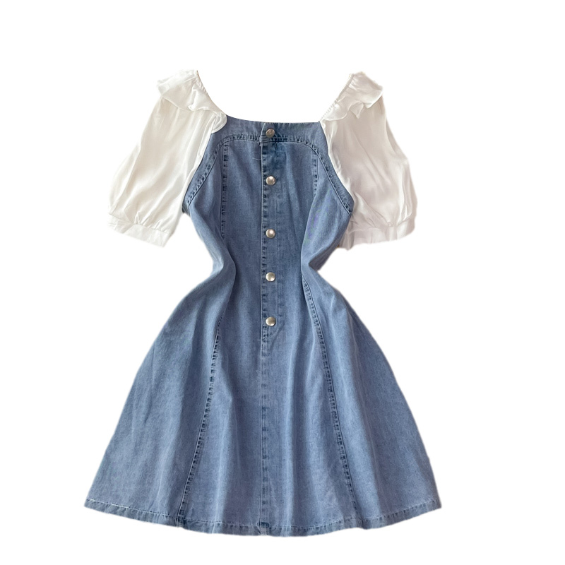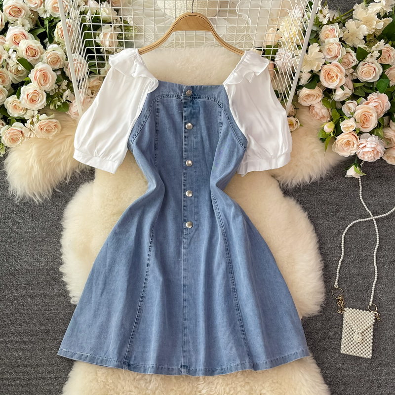 Cheap Dresses, Buy Quality Women’s Clothing Directly from China Suppliers:Square Collar Puff Sleeve Denim Dress for Women Summer New Small Waist Slimming Elegant A line Skirt Short Skirt