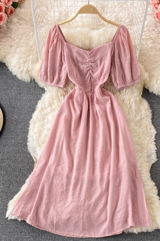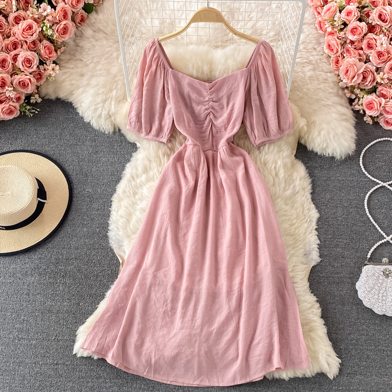 Cheap Dresses, Buy Quality Women’s Clothing Directly from China Suppliers:Square Collar Puff Sleeve Dress Summer New French Style Gentle Small Waist Tight Temperament Mid Length Skirt