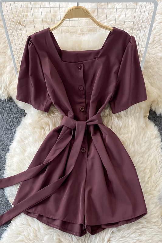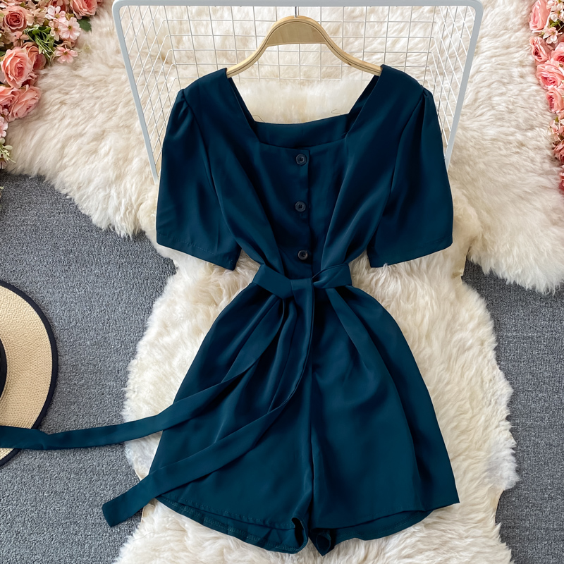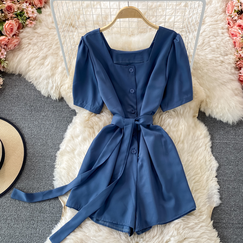 Korean style temperament square neck puff sleeve lace-up waist wide-leg jumpsuit women straight shorts small high waist
