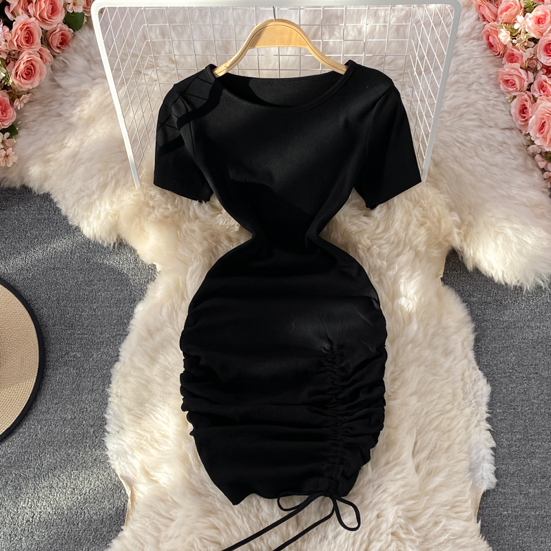 Small pleated short skirt with hips, feminine temperament, light mature style, puff sleeves, slim slimming round neck dress