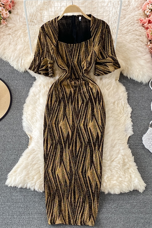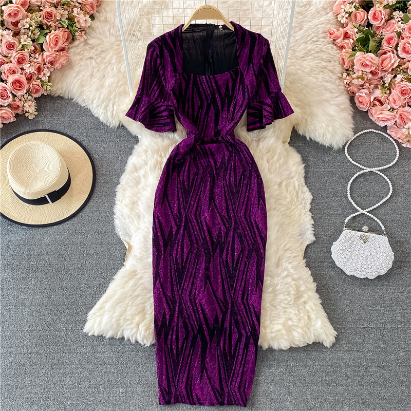 Fashion Ladies’ Evening Dress Summer New Temperament Square Collar Bright Silk Slim Fit Slimming Slit Sheath Dress