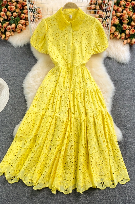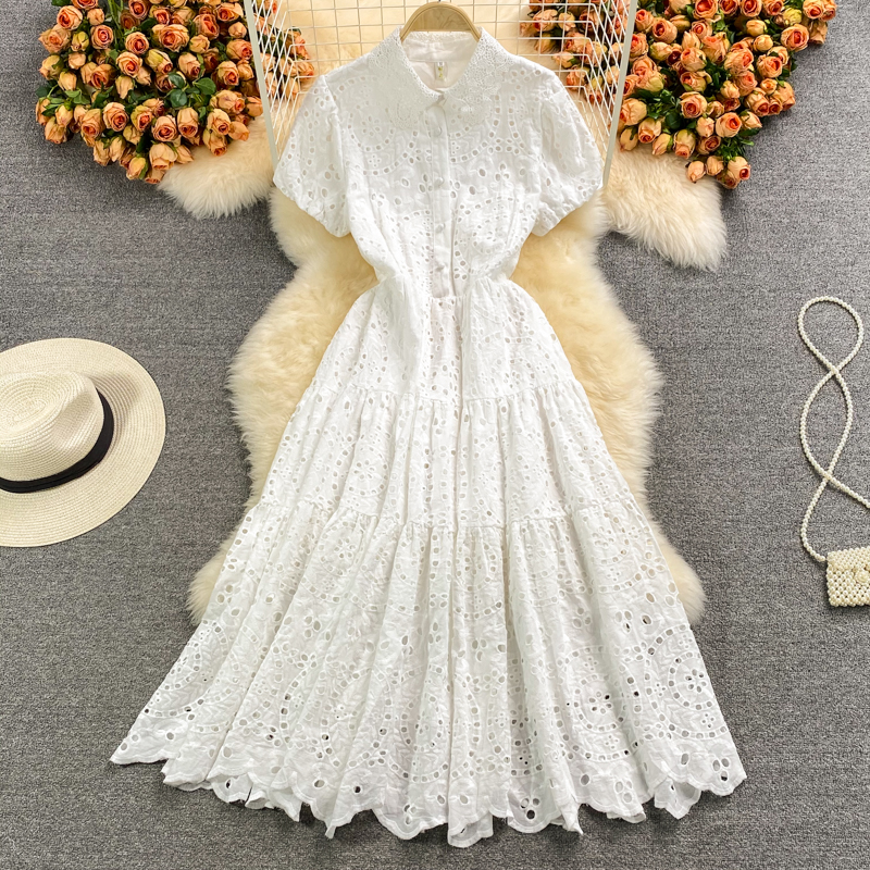 Cheap Dresses, Buy Quality Women’s Clothing Directly from China Suppliers:European Station Hollow Water Soluble Lace Lapel Dress Short Sleeve Summer Waist Controlled Large Hem A line Dress Long Skirt