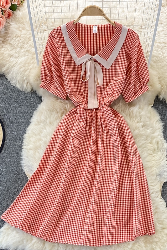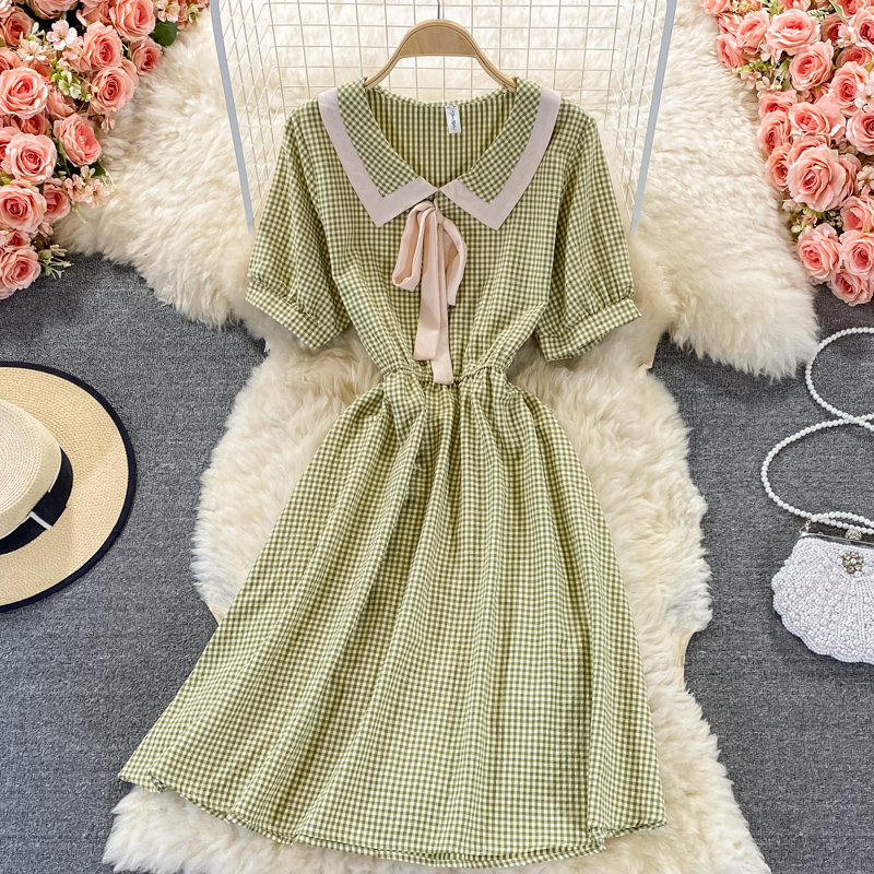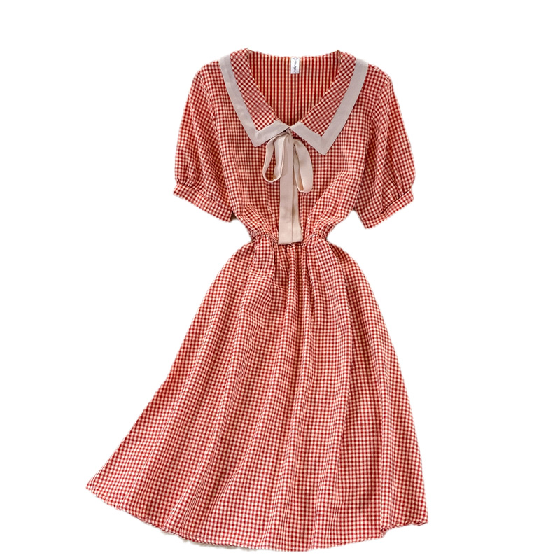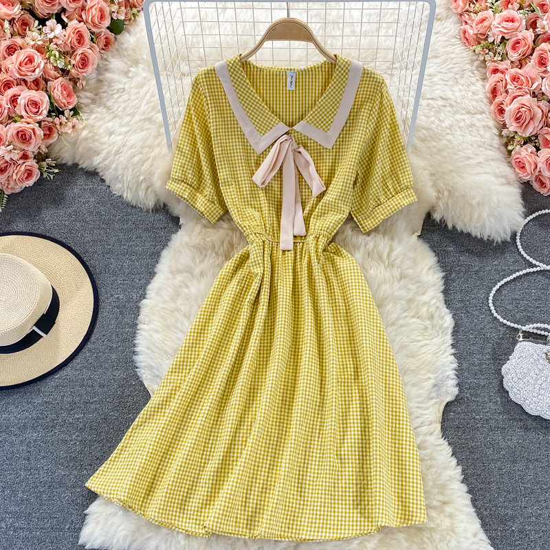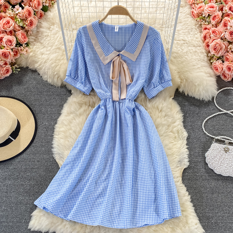 Cheap Dresses, Buy Quality Women’s Clothing Directly from China Suppliers:Sweet College Style Small First Love Skirt Summer New Bow French Plaid Doll Collar Dress