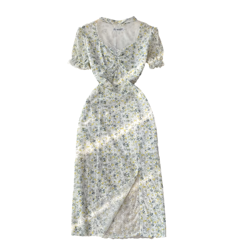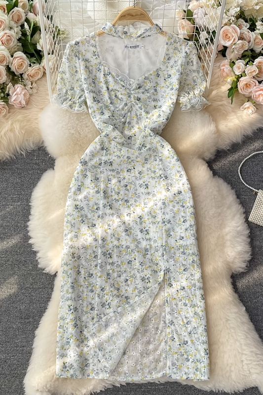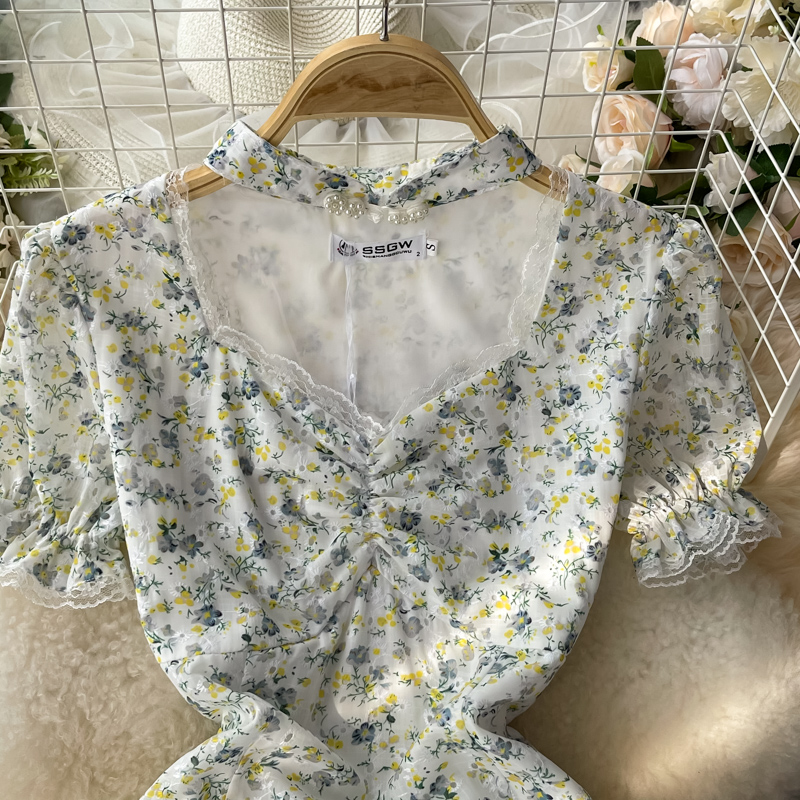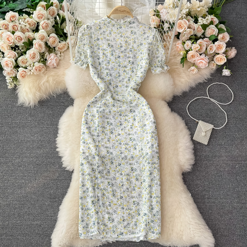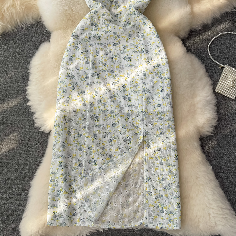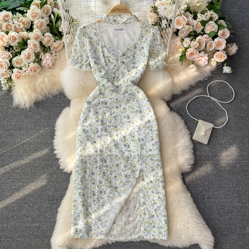Cheap Dresses, Buy Quality Women’s Clothing Directly from China Suppliers:Summer New Gentle Fairy Puff Sleeve First Love Skirt Split V neck Halter Chiffon Floral Dress