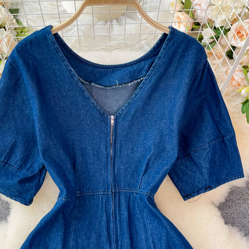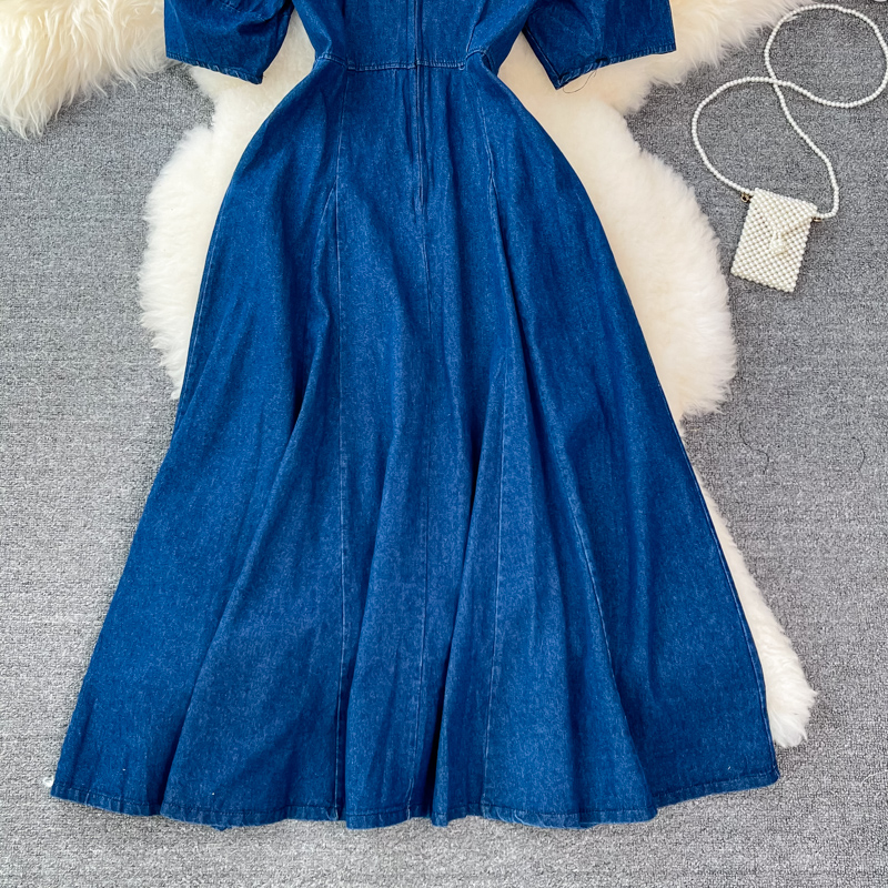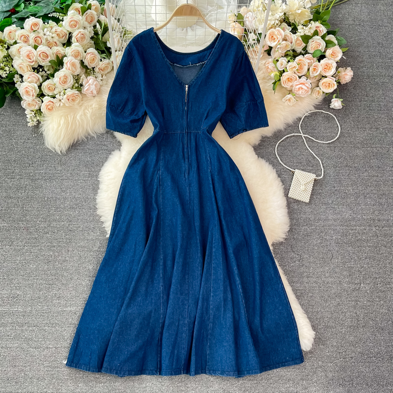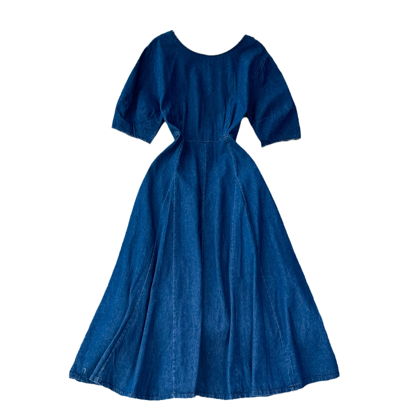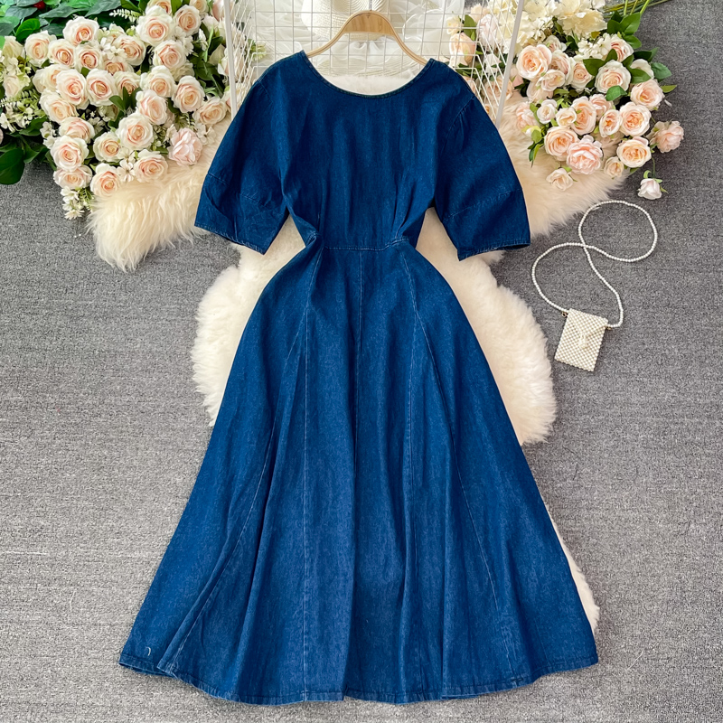 Cheap Dresses, Buy Quality Women’s Clothing Directly from China Suppliers:summer New Retro High Waist Hepburn Style Tight Waist Slimming round Neck Denim Dress Swing Long Dress