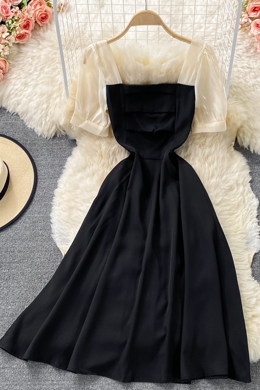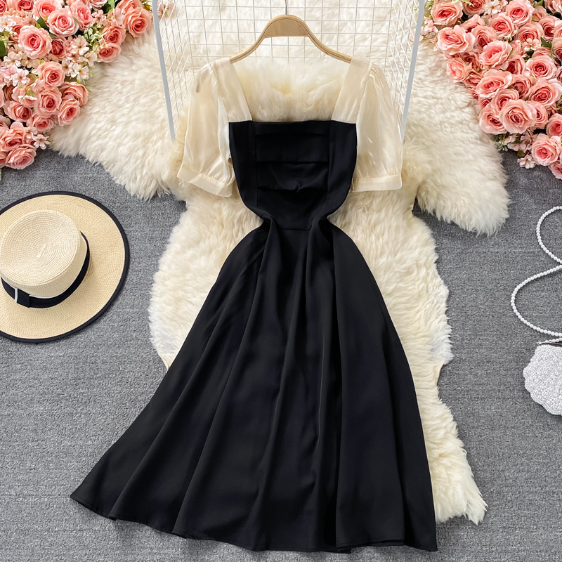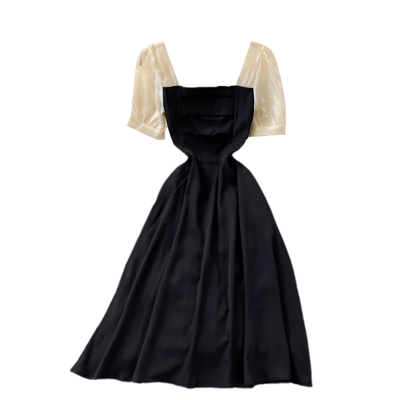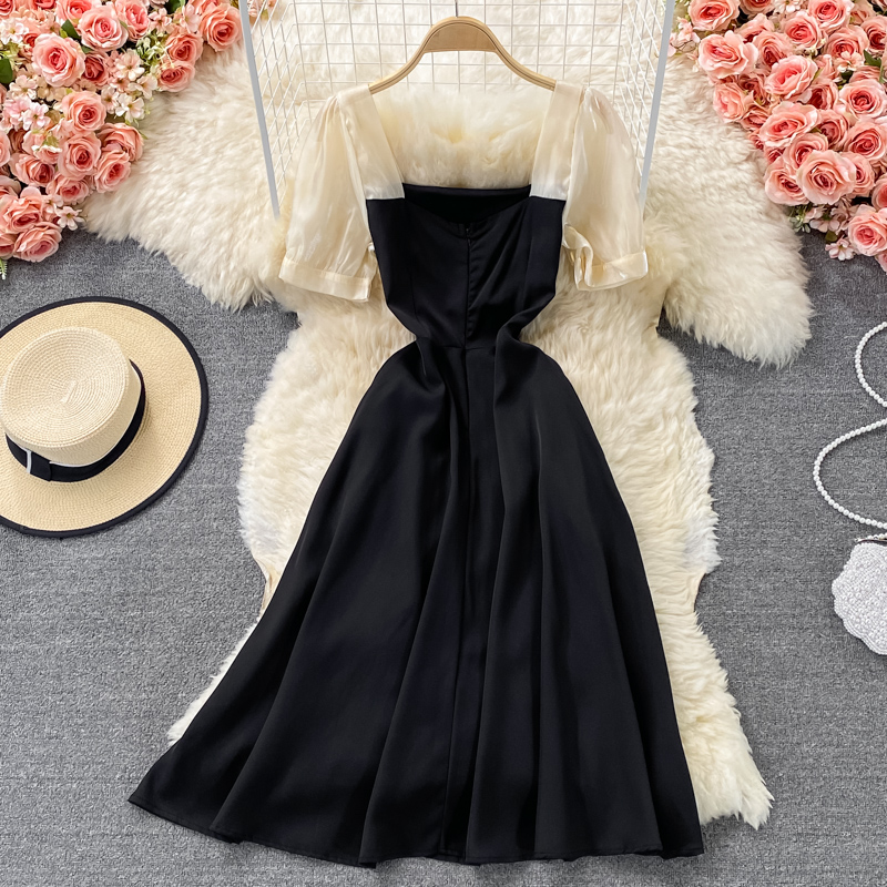 Cheap Dresses, Buy Quality Women’s Clothing Directly from China Suppliers:Summer New French Retro Color Matching Square Collar Dress Puff Sleeve Waist Slimming Graceful Long Expansion Skirt