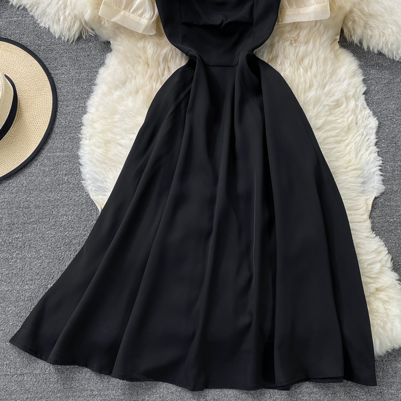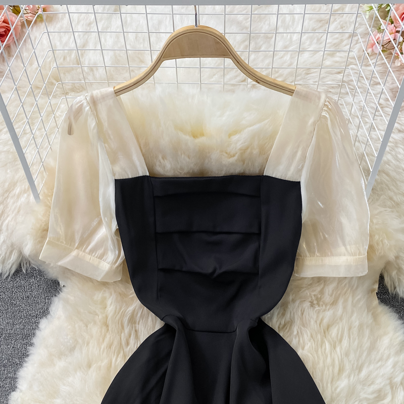 Summer New French Retro Color Matching Square Collar Dress Puff Sleeve Waist Slimming Graceful Long Expansion Skirt