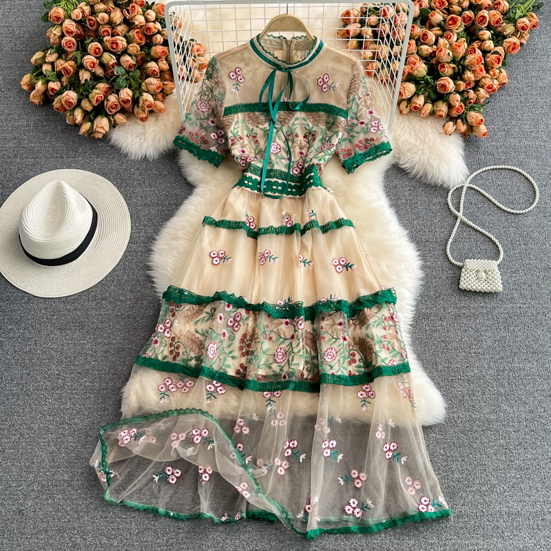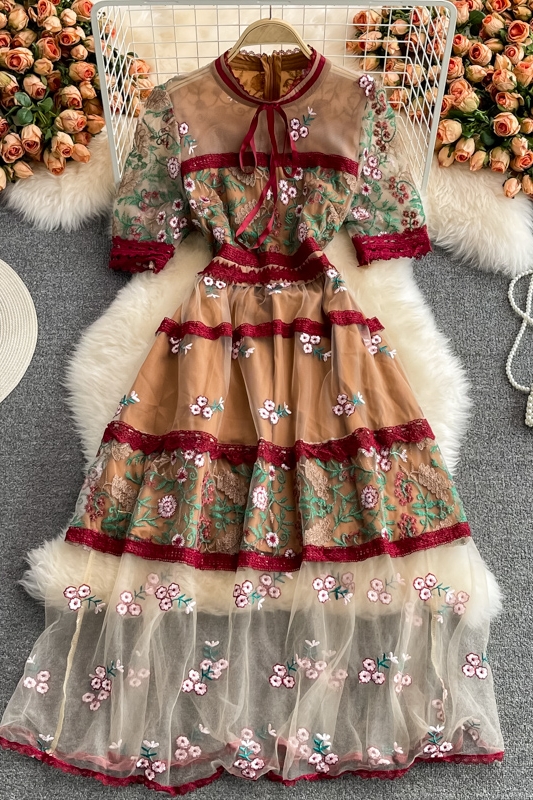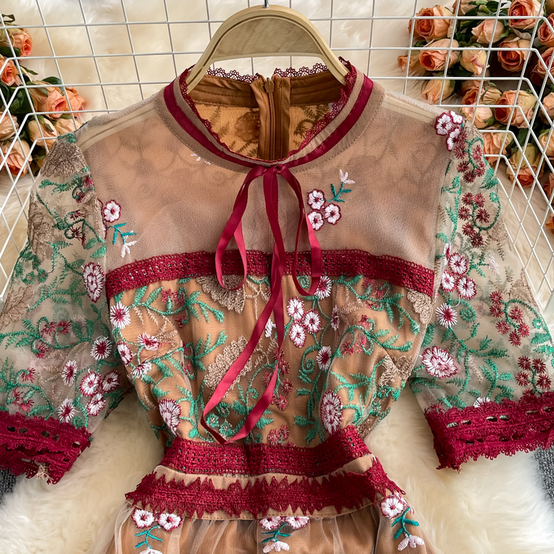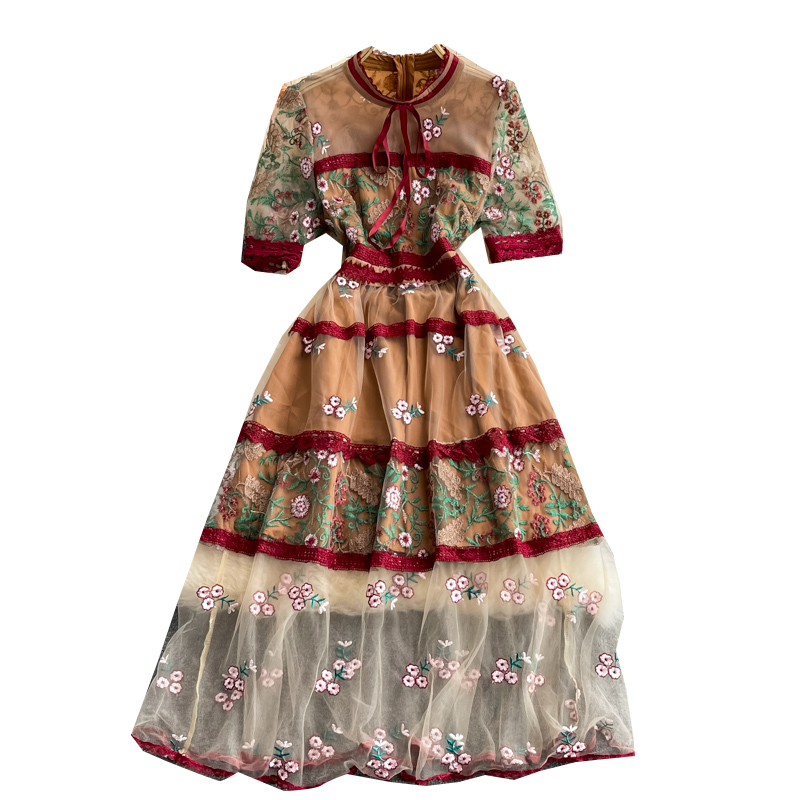 Cheap Dresses, Buy Quality Women’s Clothing Directly from China Suppliers:Summer New Retro High End Temperament Stand up Collar Tie Mesh Embroidery Stitching Lace A line Dress