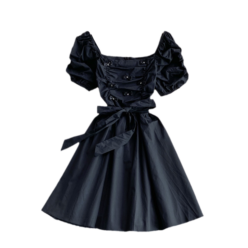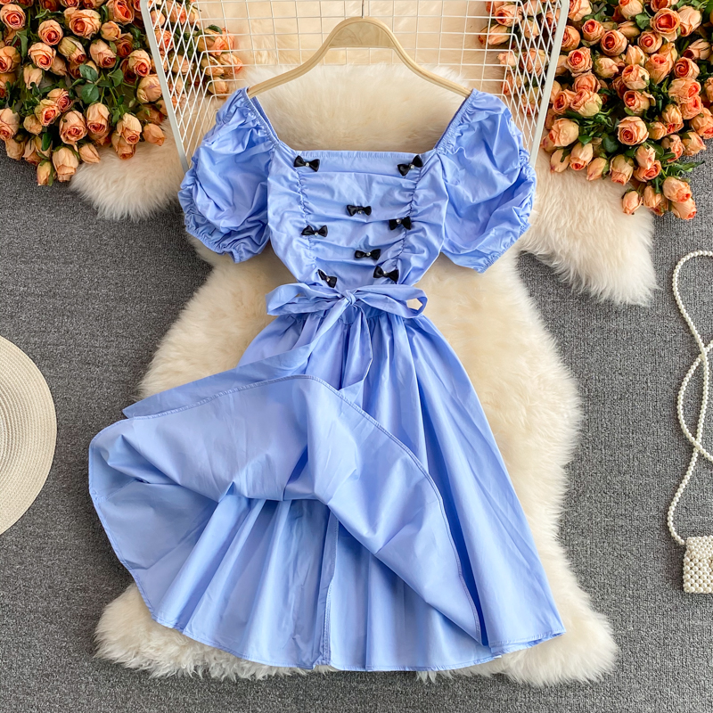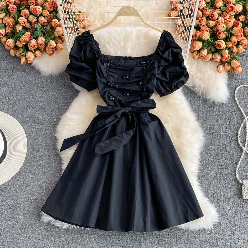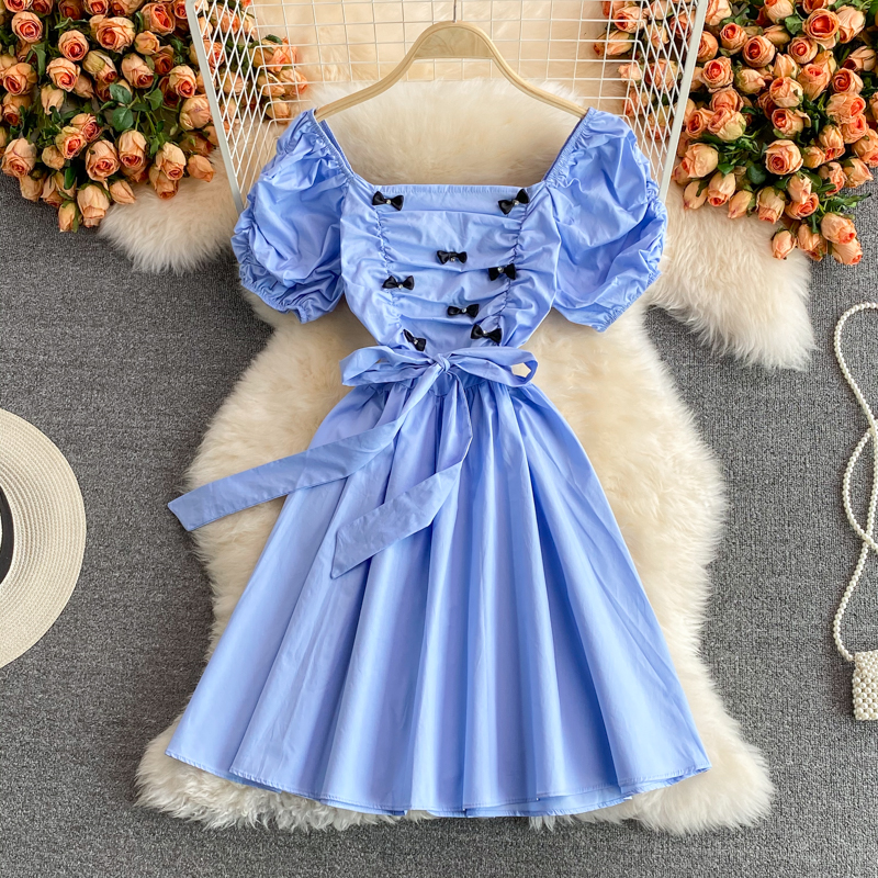 Cheap Dresses, Buy Quality Women’s Clothing Directly from China Suppliers:Korean Dongdaemun Summer Rhinestone Bow Square Collar Puff Sleeve Pleated Dress Mid Length A line Dress