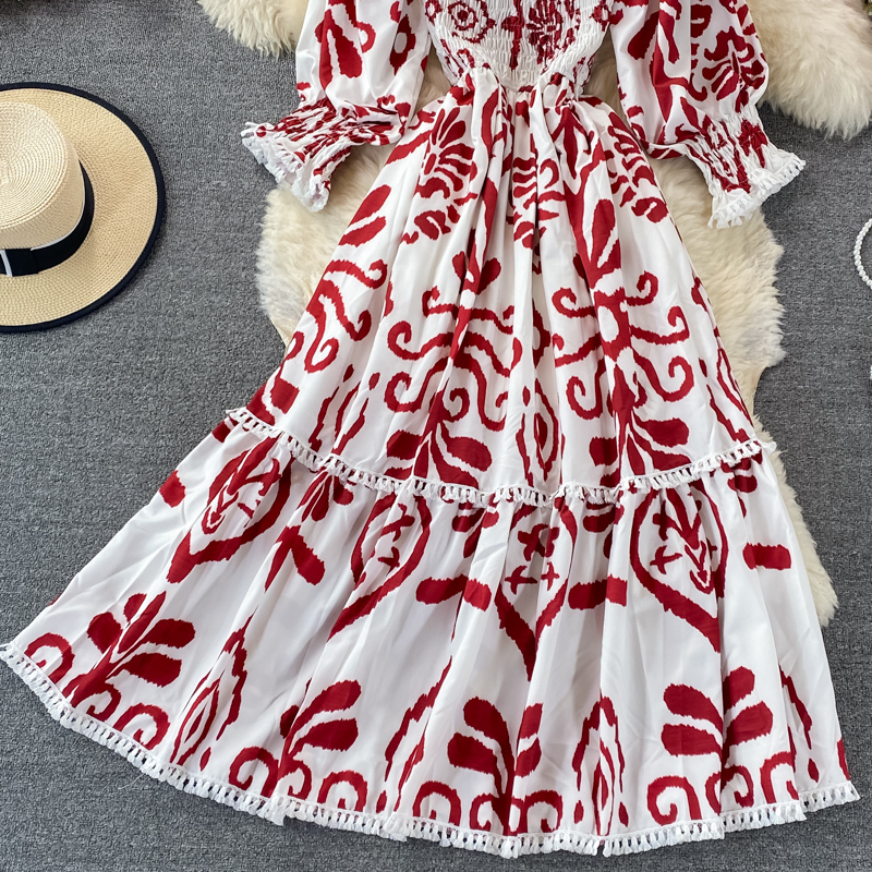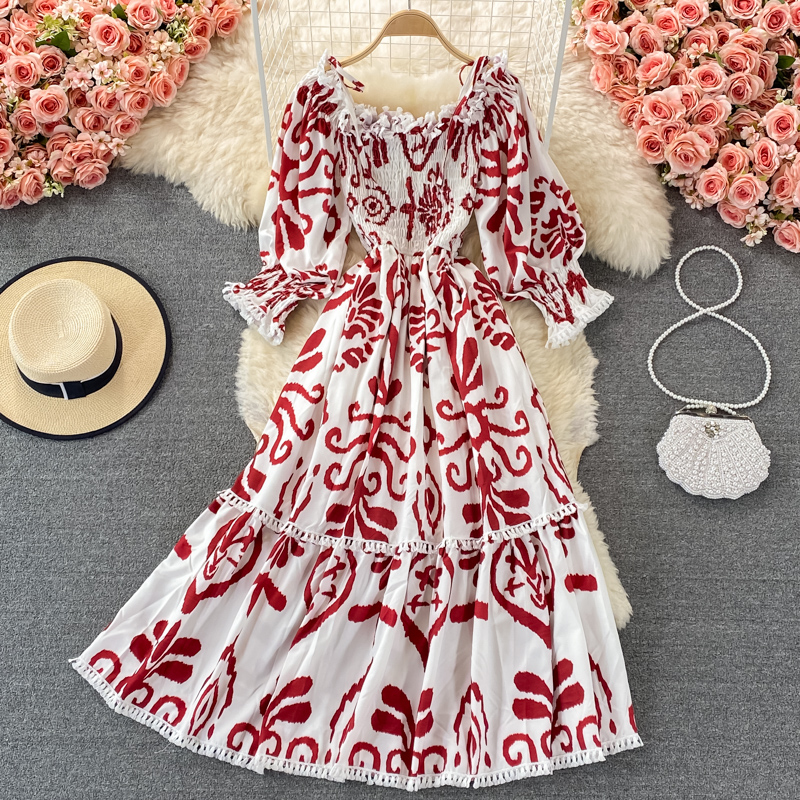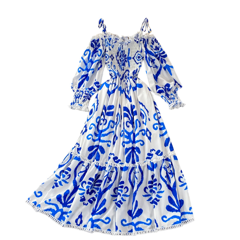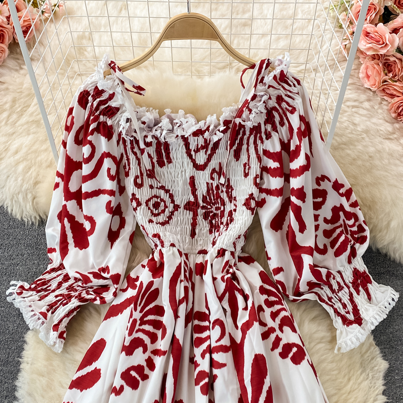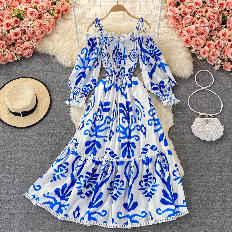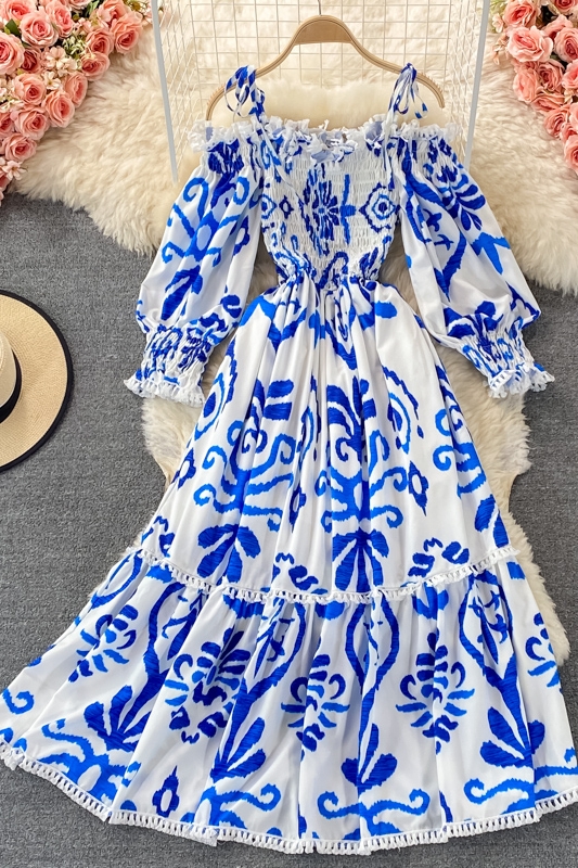 Cheap Dresses, Buy Quality Women’s Clothing Directly from China Suppliers:spring and autumn new lace up collar off shoulder celadon printed dress, long sleeved waist, thin and large length dress
