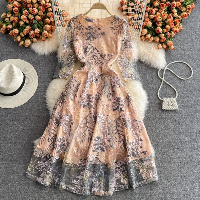 Cheap Dresses, Buy Quality Women’s Clothing Directly from China Suppliers:Summer High End Retro Crew Neck Embroidered Waist Slimming Lace Dress Elegant Graceful Swing Long Dress