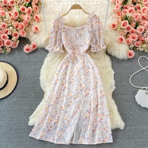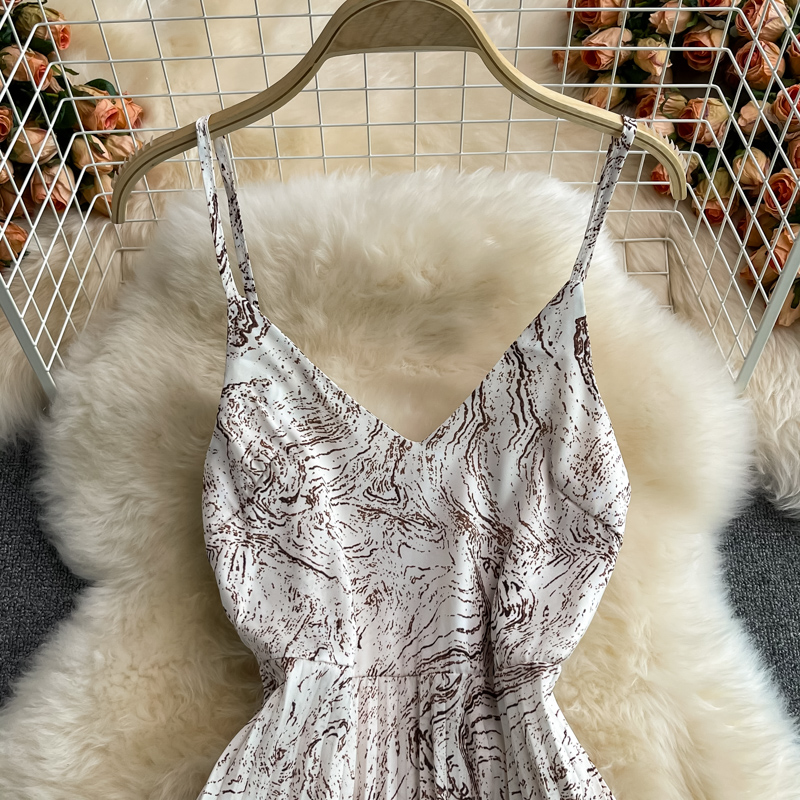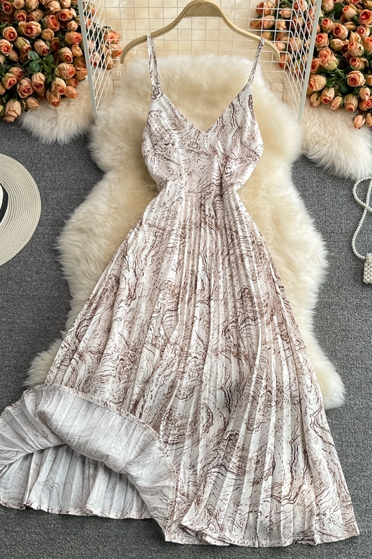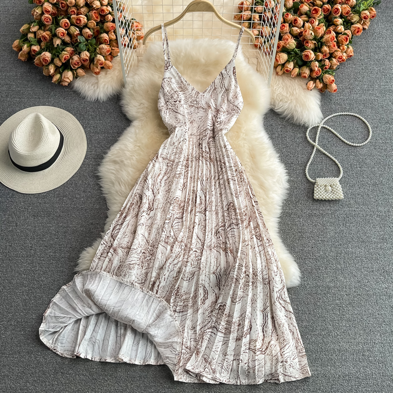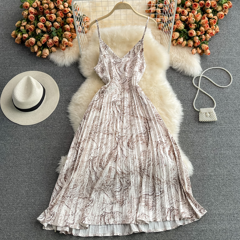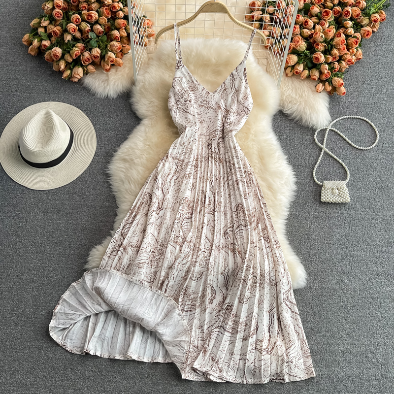 Seaside Holiday Floral Slip Dress Vest Chiffon Pleated Dress Women’s Summer Slimming Temperament Fairy Long Dress