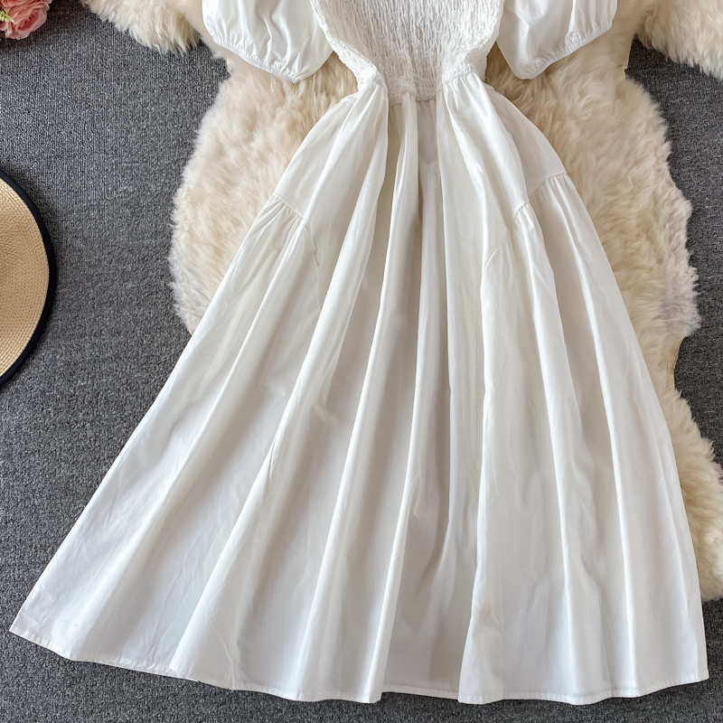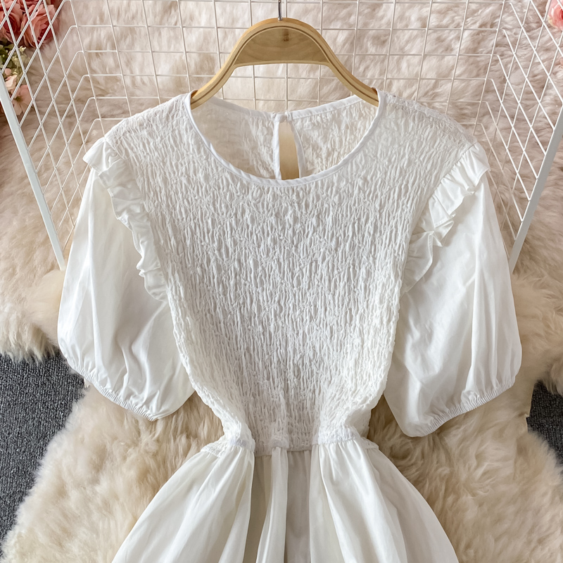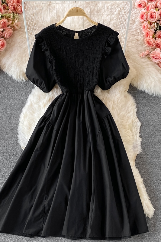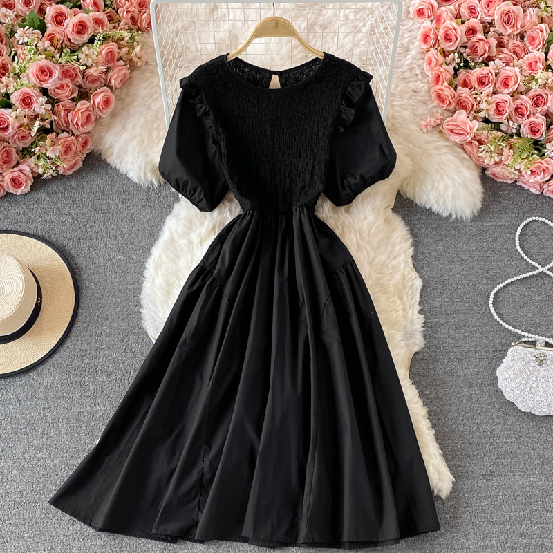 Cheap Dresses, Buy Quality Women’s Clothing Directly from China Suppliers:French Style Black round Neck Dress Summer Women’s Fashion Puff Sleeve Ruffled Waist Tight Hong Kong Style Mid Length Skirt
