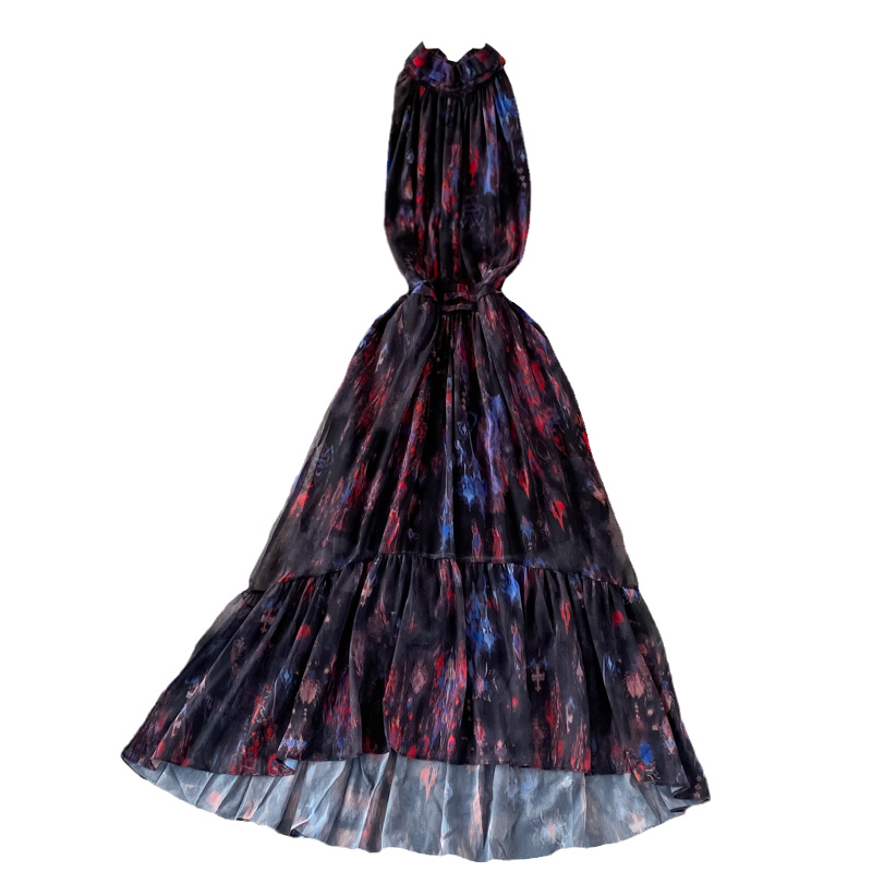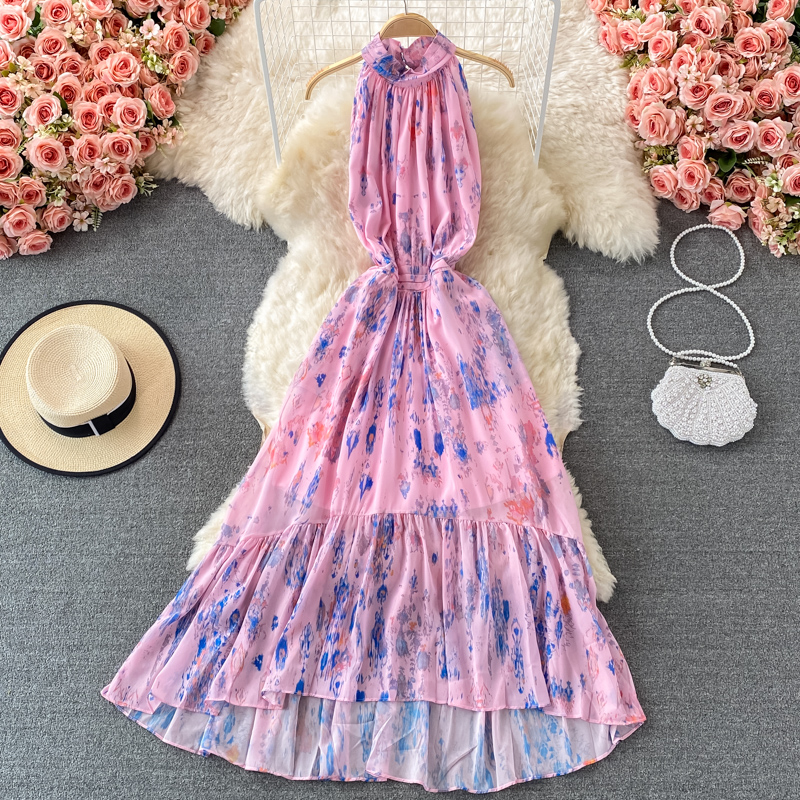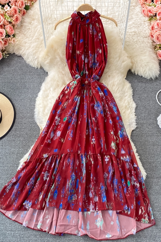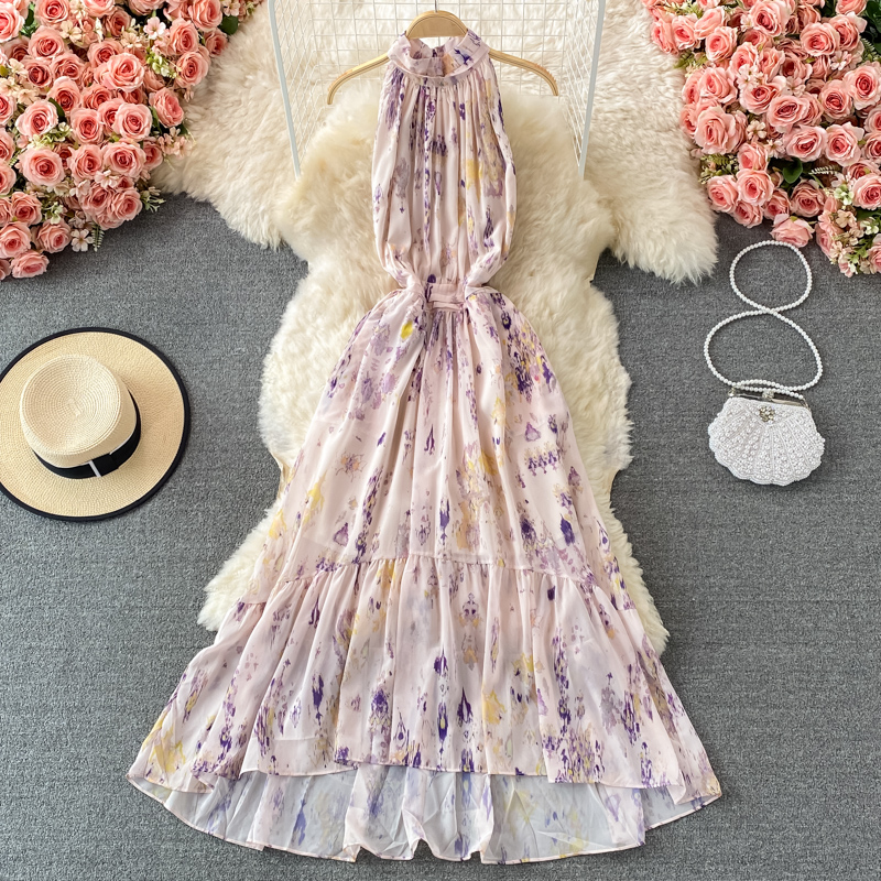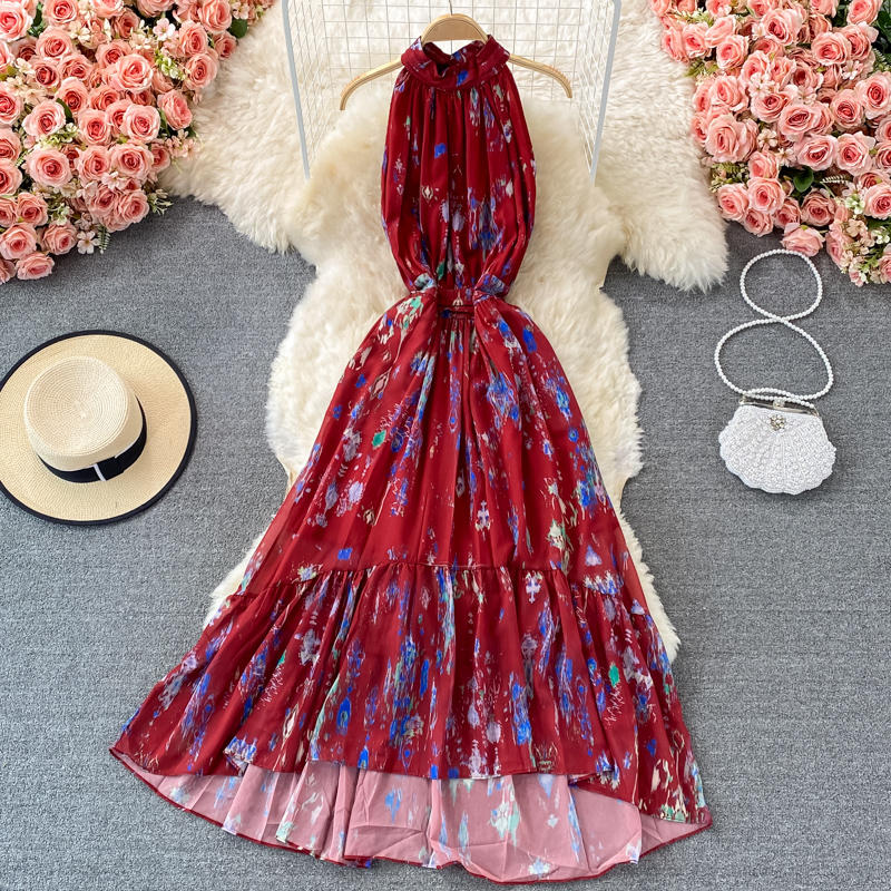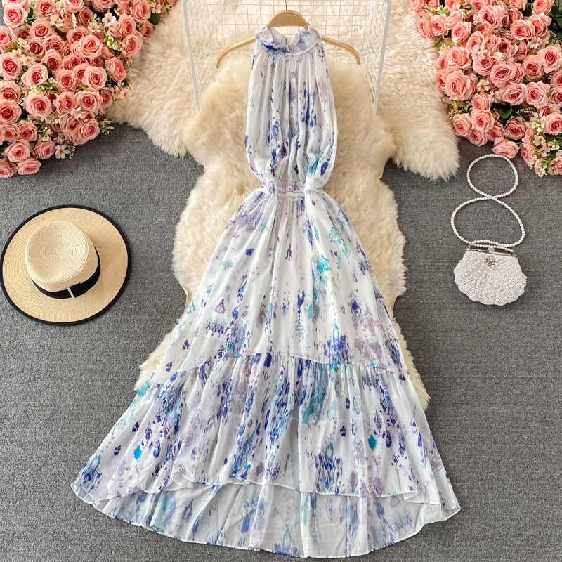 Printed Halter off-the-Shoulder Dress Sleeveless Summer French Elegance Large Swing Dress