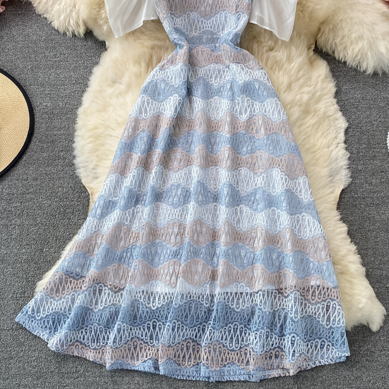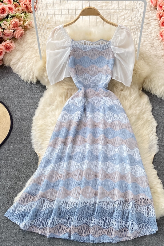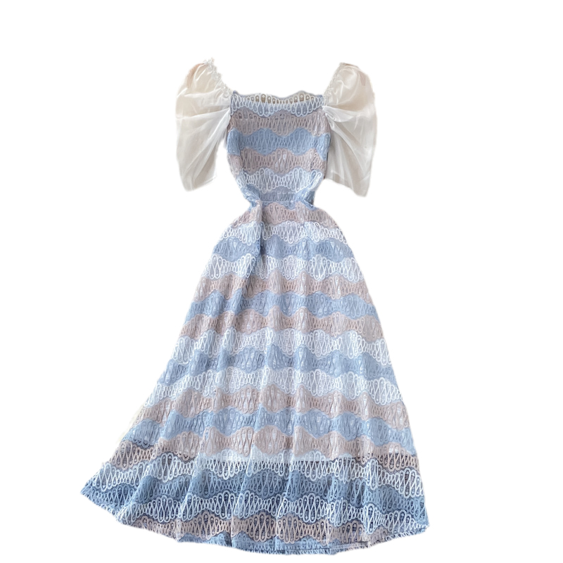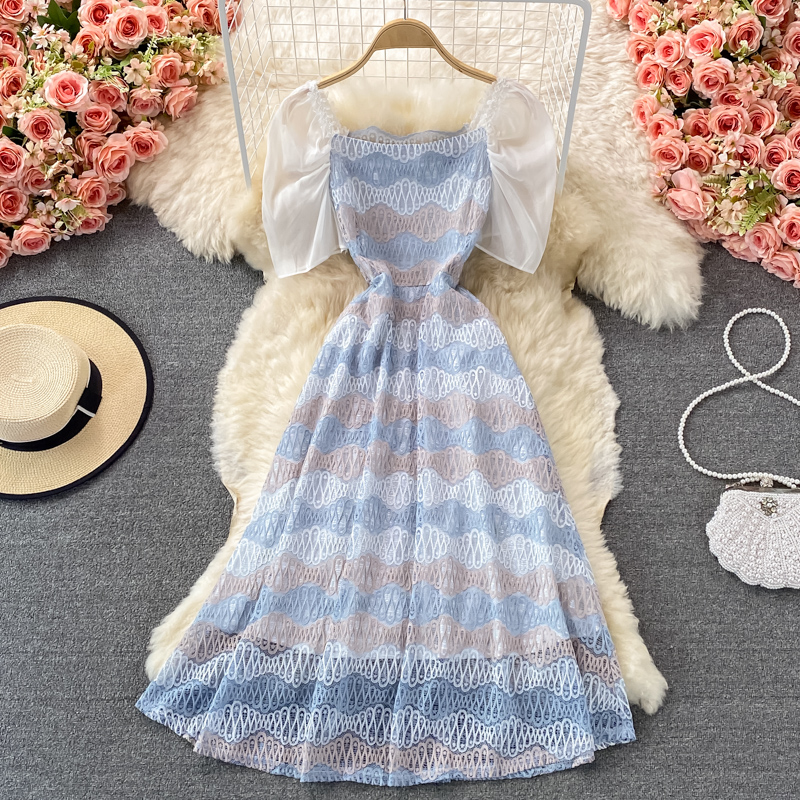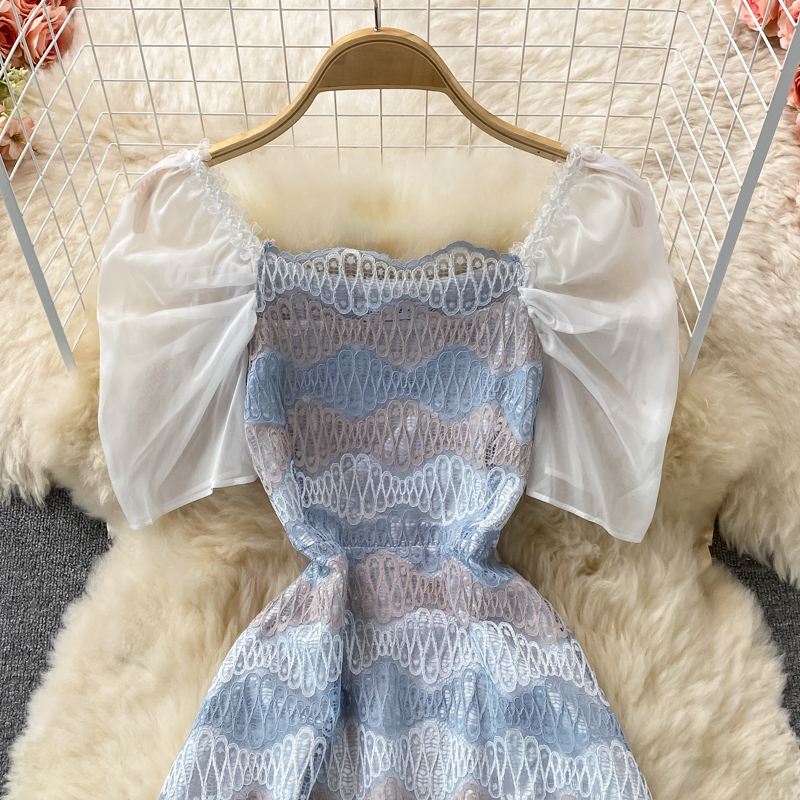 Summer New Tea Break French First Love Sweet Gentle Fresh Fairy Square Collar Puff Sleeve Lace Dress