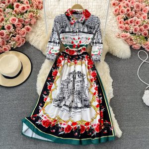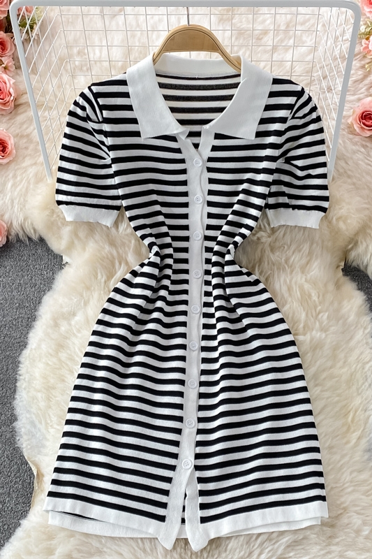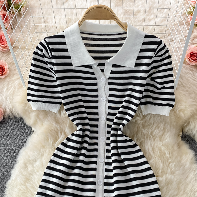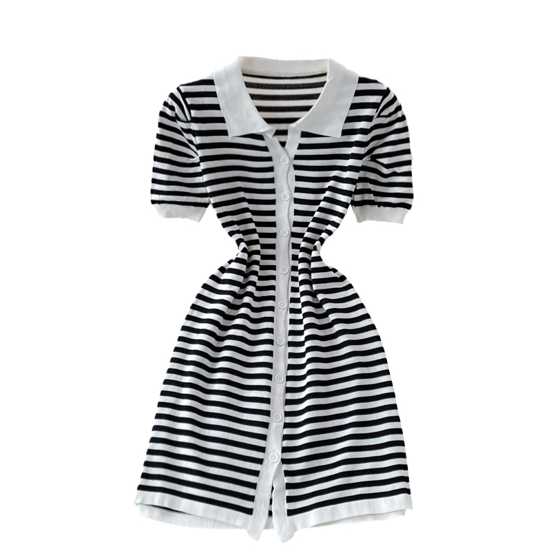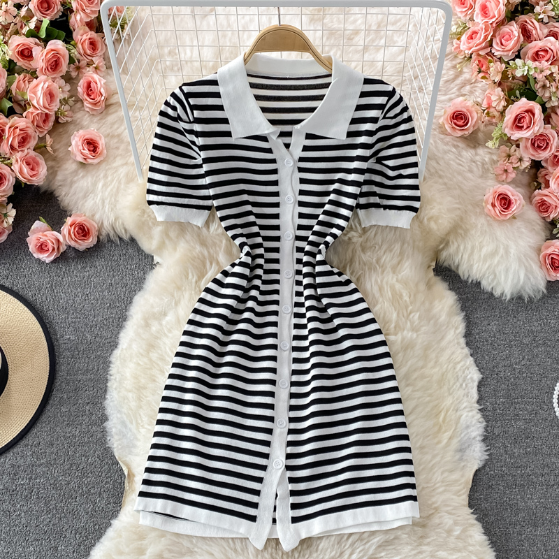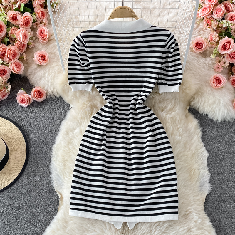 Summer Polo Collar Puff Short Sleeve Single-Breasted Slim-Fit Pullover Mid-Length Vintage Stripe Knitted Dress