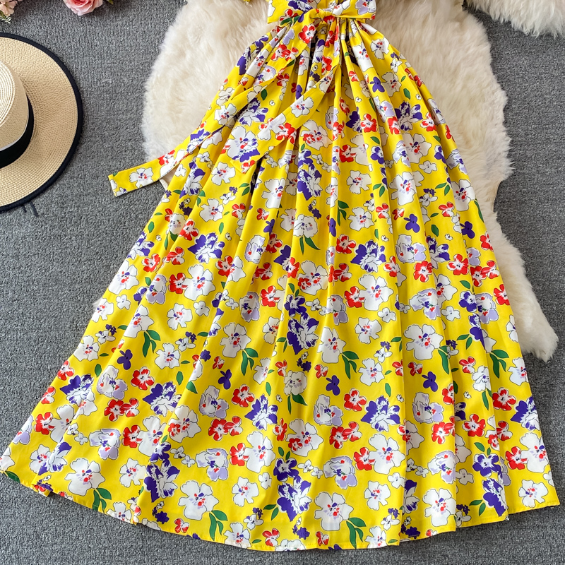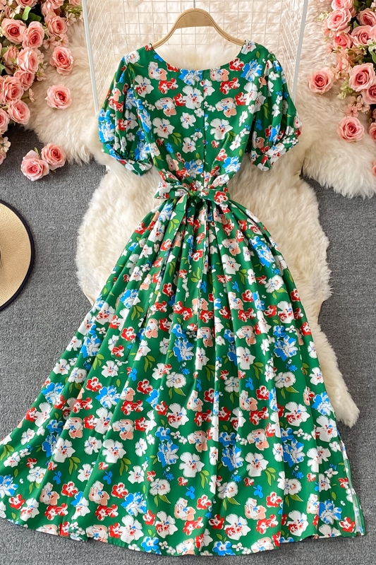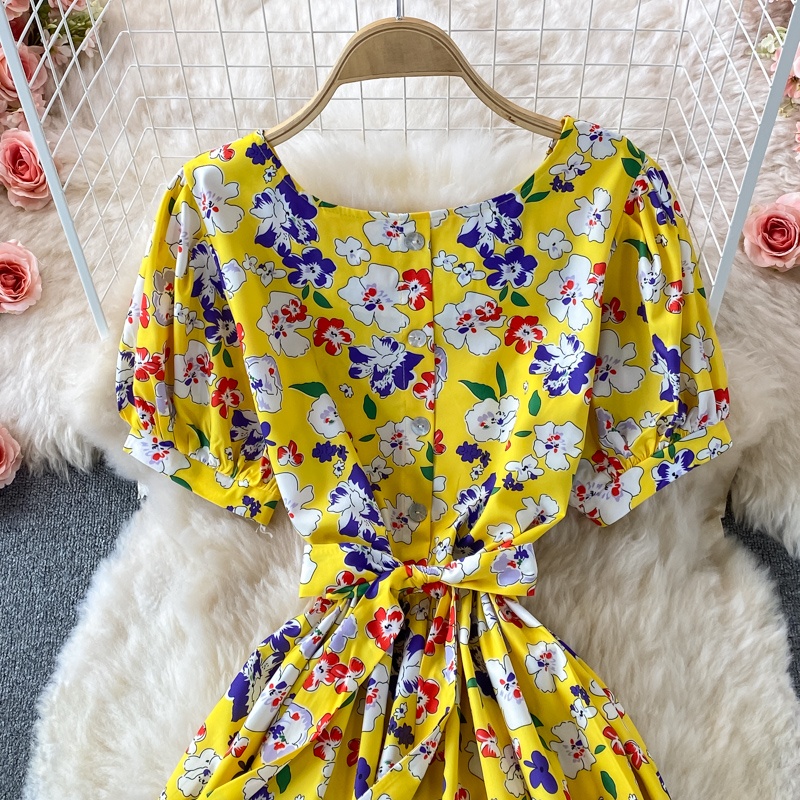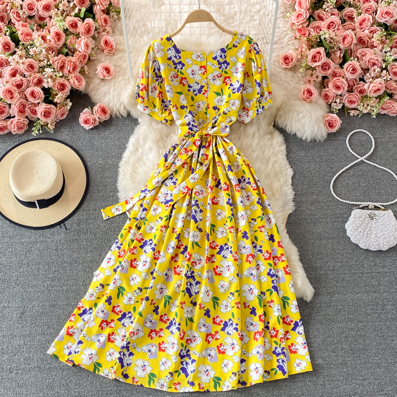 Cheap Dresses, Buy Quality Women’s Clothing Directly from China Suppliers:Korean Chic Summer Retro French round Neck Waist Trimming Slimming Lace up Large Swing Dress Puff Sleeve Floral Dress