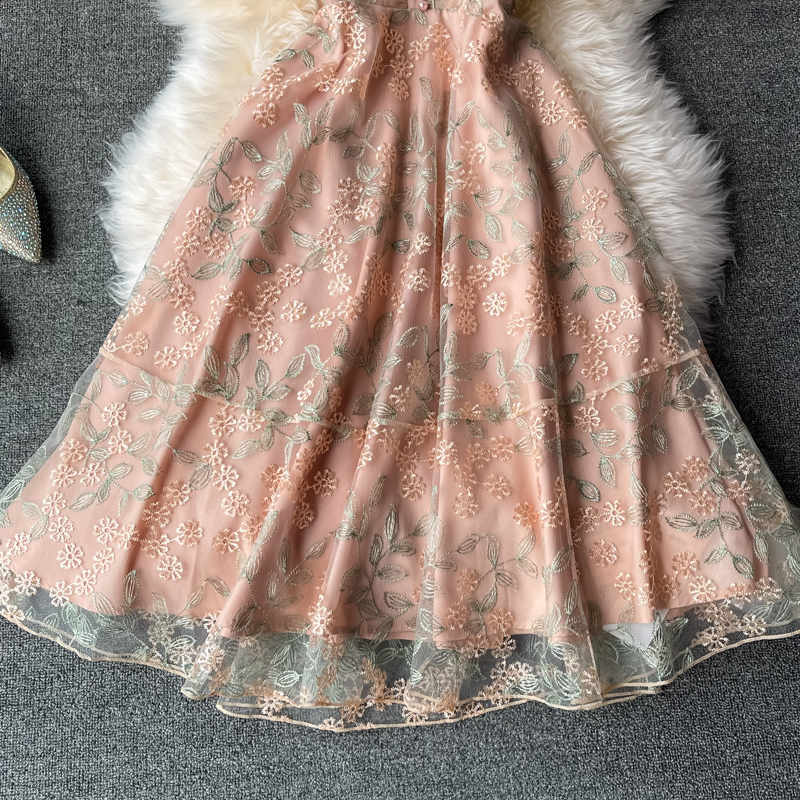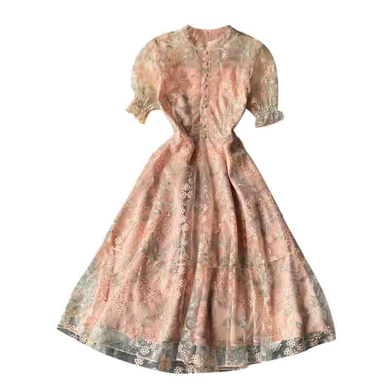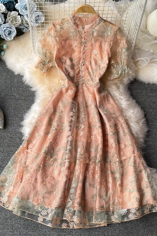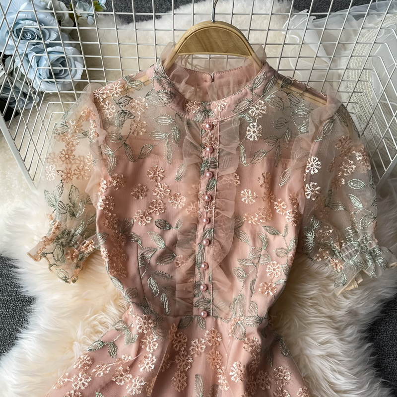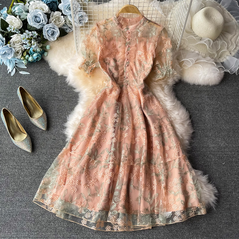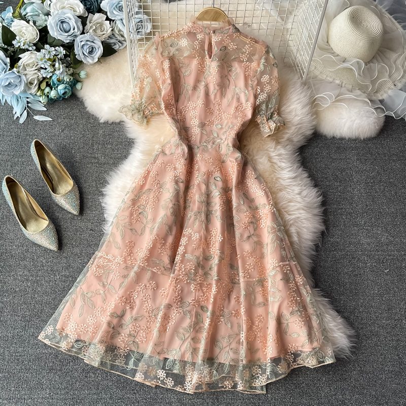 Cheap Dresses, Buy Quality Women’s Clothing Directly from China Suppliers:Ladies temperament lace embroidery wooden ear stand collar dress summer waist was thinner mid length skirt short sleeves